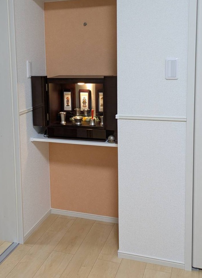 和室の戸袋の上に「シエナ タモ」を設置させて頂きました。明るいタモ材は和室の雰囲気にもよく似合います。ご本尊と脇仏は同じタモ製のスタンド掛け軸を納めさせて頂きました。