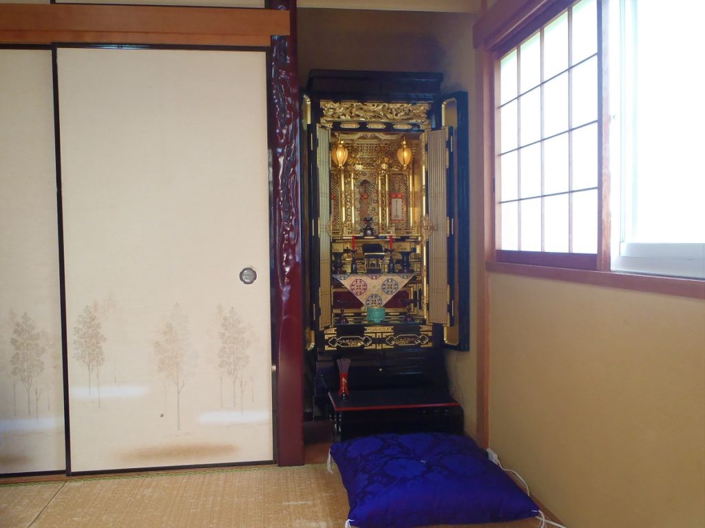 年忌法要に合わせてお仏壇を納品させて頂きました。大きく立派な木彫りの阿弥陀如来像を以前からお祭りされていて通常の仏壇では仏像の背が高すぎて納まらないので特別仕様の仏像の入る部分を大きくした仏壇を製作しました。阿弥陀如来像も線香の煙でくすぶっておられたのできれいに洗った後、江戸時代から伝わるお仏像の良さを残すため古色仕上げをしました。仏壇のサイズに合わせてリフォームをされた和室の真ん中に設置させて頂きました。