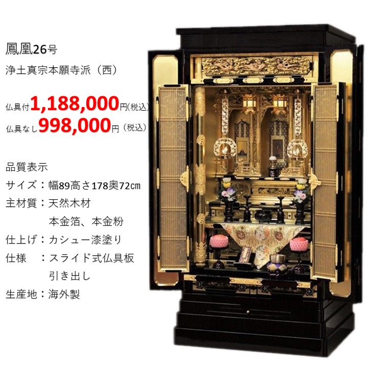 - 京型金仏壇 鳳凰26号仏具付 幅89㎝高178㎝ 浄土真宗本願寺派(西本願寺)118.8万円(税込)