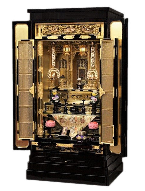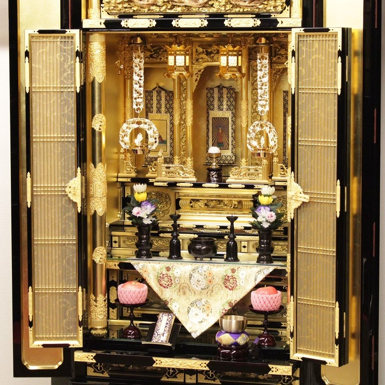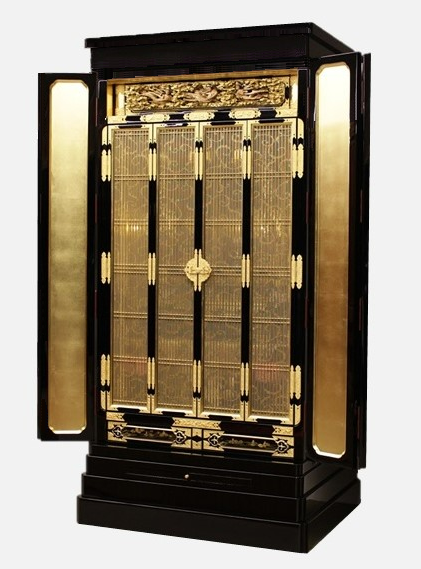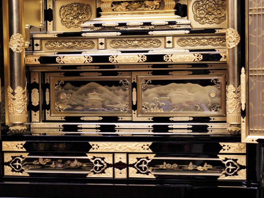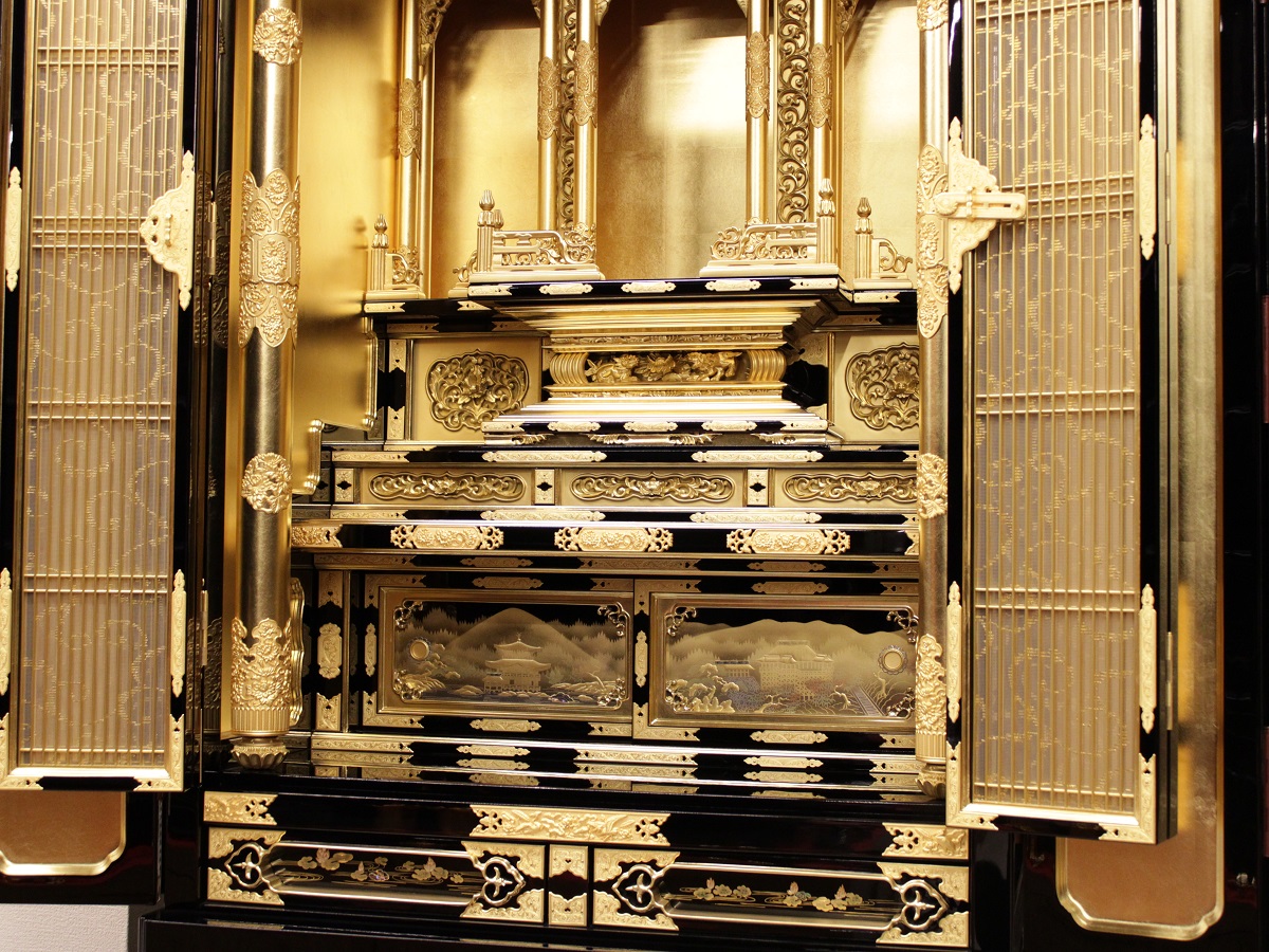 伝統技術で製作された京型の西本願寺、興正寺専用の金仏壇です。光沢感のある漆黒のカシュー漆塗りで仕上げられ、金沢産100%の本金箔が仏壇内部に施され豪華な輝きと共に圧倒的な存在感を誇ります。戸袋の正面板には金閣寺と清水寺の図柄が伝統技法【蒔絵】で美しく描かれています。仏壇の顔ともいえる欄間(ランマ)の彫りは三人の天女が雲の中を飛んでいるデザインが刻まれていて阿弥陀如来がおられる極楽浄土の空を表しています。