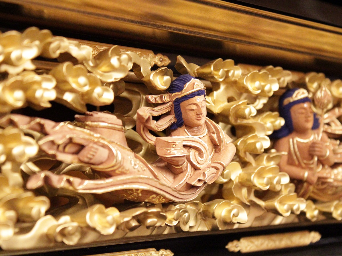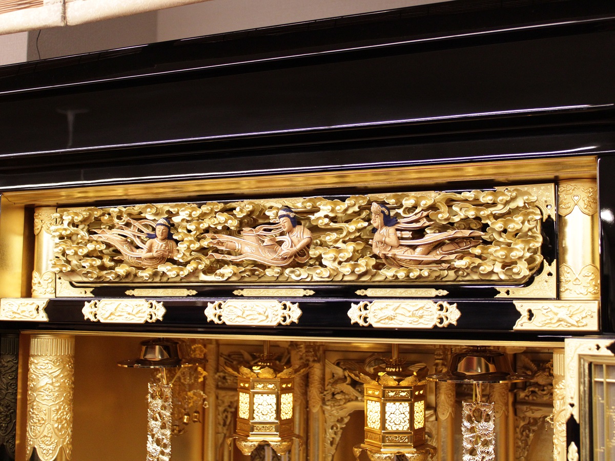 仏壇の顔ともいえる欄間(ランマ)の彫りは三人の天女が雲の中を飛んでいるデザインが刻まれていて阿弥陀如来がおられる極楽浄土の空を表しています。天女は香木で仕上げられ雲には金沢産100%の本金粉が施され上品な輝きになっています。