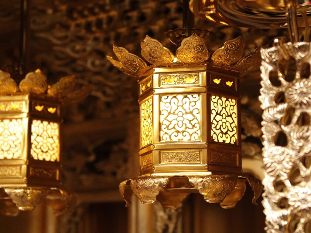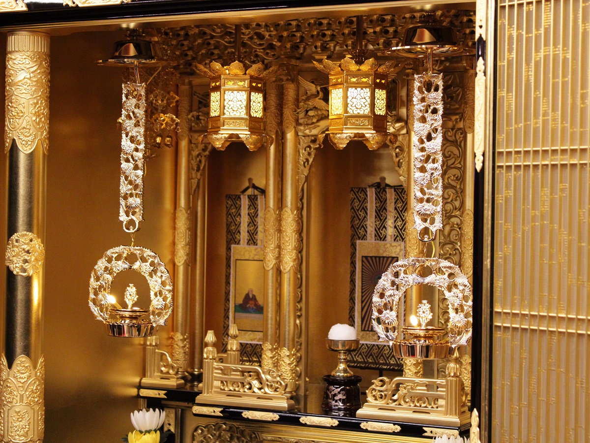 ご本尊が安置される手前に吊り灯篭1対と輪灯1対が吊り下げられ合計4個のLED照明の灯りが仏壇内部を幻想的に照らします。LED照明は「発熱しない」「電球が長寿命」「省エネ設計」の特徴があり、また紫外線を出さないため回りの素材が経年劣化しにくいという特徴があります。