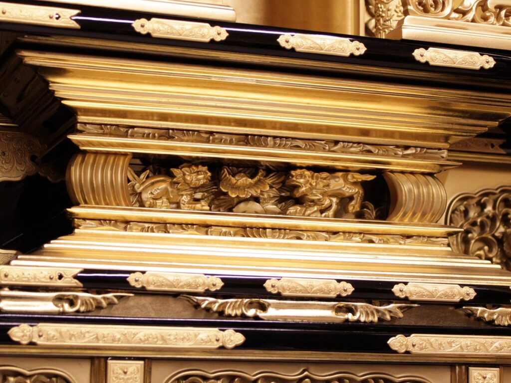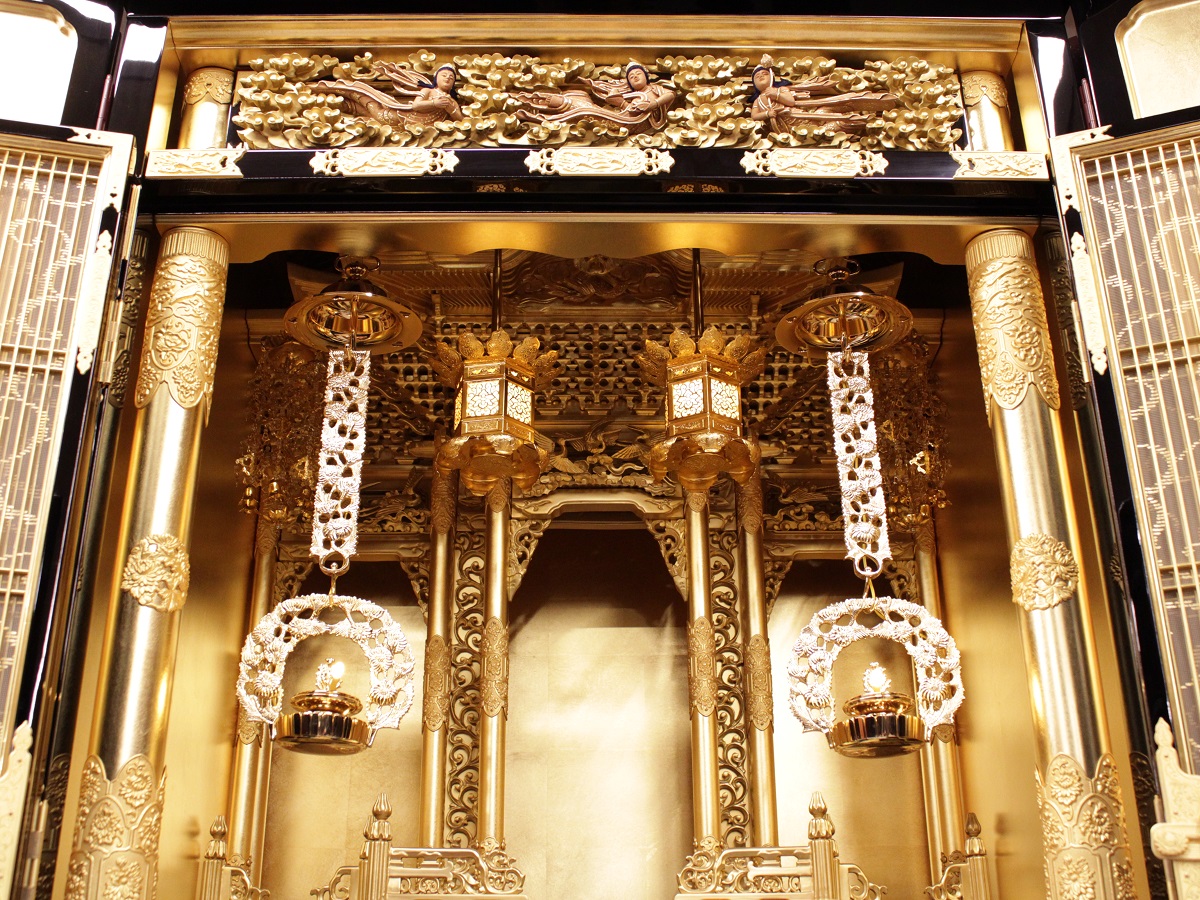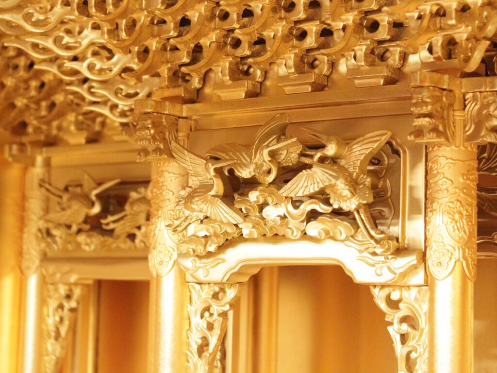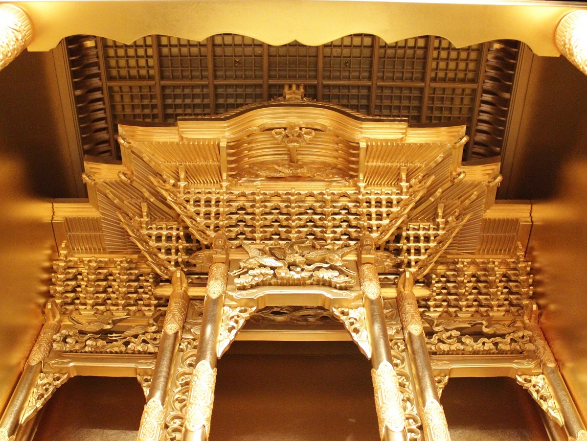 仏壇内部の屋根や柱は宮殿(くうでん)と呼ばれ一重破風屋根と本金箔張りの柱で西本願寺の阿弥陀堂を模して造られそこに阿弥陀如来が安置されます。天井は細かい格子が一面に張り巡らされた折り上げ合天井になっていてお寺の内部天井を模して造られています。