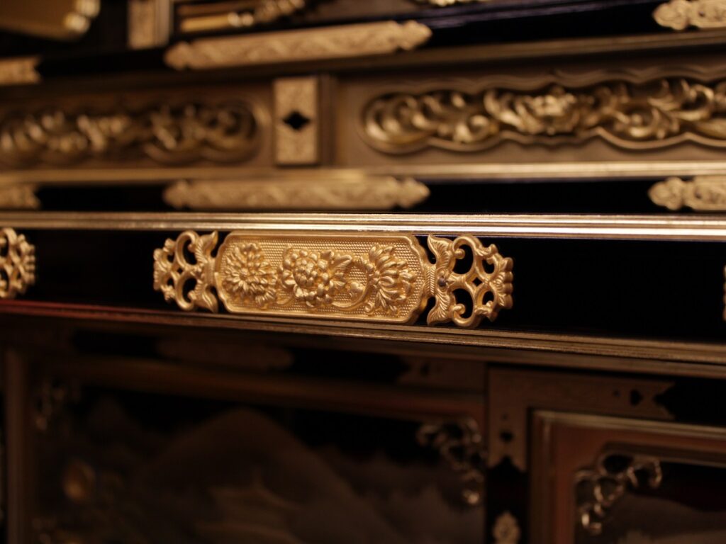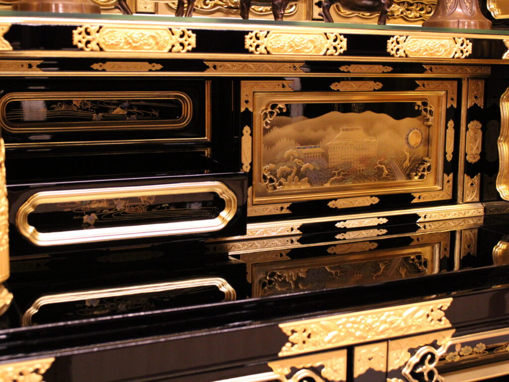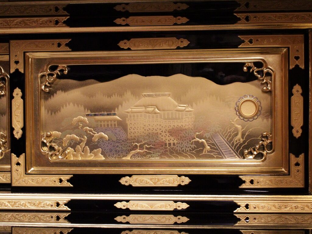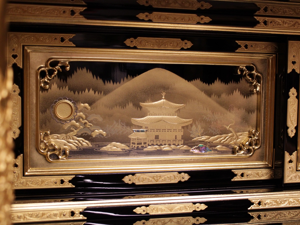 下段奥の戸袋や引き出しの正面板に伝統技法【蒔絵】が施され一つ一つ職人の手で細部まで描かれています。戸袋の正面板のデザインは京都の名所 清水寺と金閣寺の図柄が描かれています。