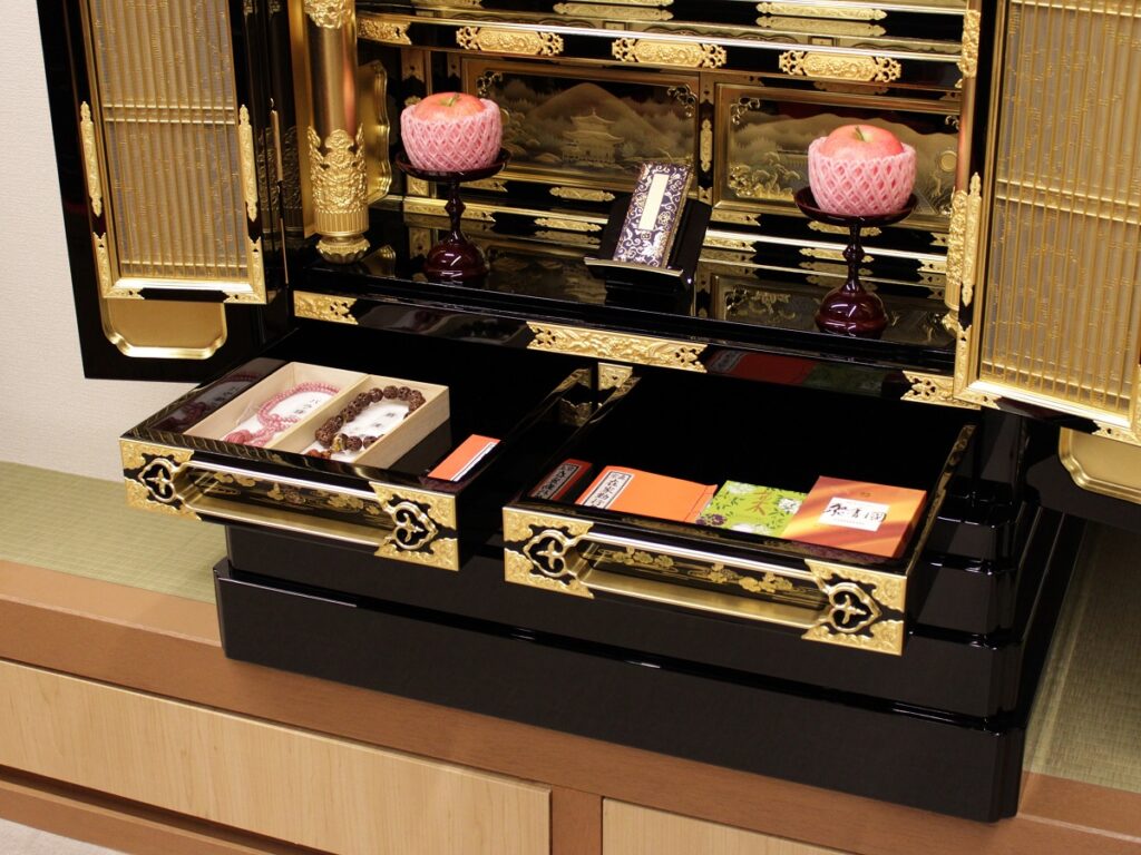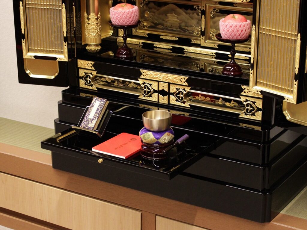 ・引き出しの下にももう一段引き出せる仏具板がついています。おりんや過去帳、教本などを設置して頂けます。