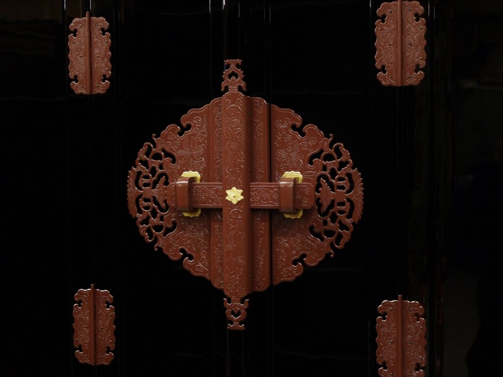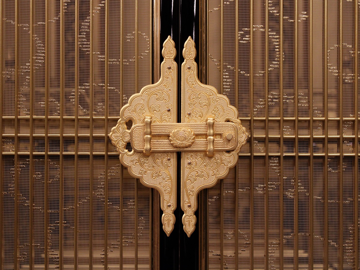 世界的にも有名な金属加工の町『燕三条』。この町で製作された高品質の神社仏閣用の錺金具を使って『京型金仏壇 鳳凰26号』は作られています。外側の正面扉には京型金仏壇独特の京色と呼ばれるエンジ色に着色し焼付塗装された真鍮金具が打たれ京都らしいはんなりとした趣を見せています。内側扉には本金消しメッキ塗装された上品な色合いの八双型金具が打たれています。手前の大柱には厚みのある真鍮金具が打ち込まれています。