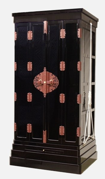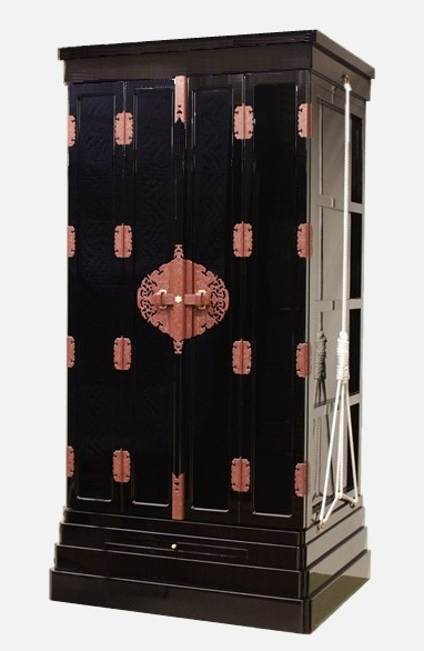 カシューとは漆科植物(カシューナッツの実)から採取した植物性の油を主原料とした漆系の塗料です。漆と同様に塗り肌のきめが細かく素晴らしい優雅さを持っています。光沢がすばらしく、塗膜は非常に強靭で、しかも弾性力に富んでいます。深みのある漆黒の色合いが高級感を演出します。仏壇のサイドに化粧紐が結ばれています。