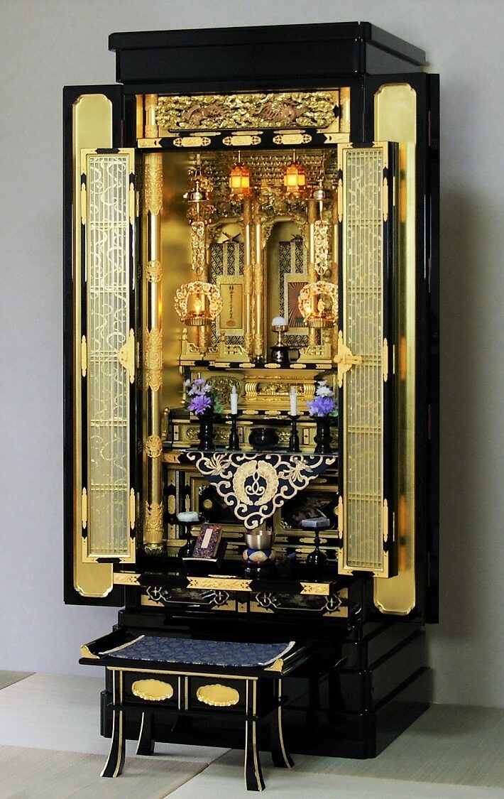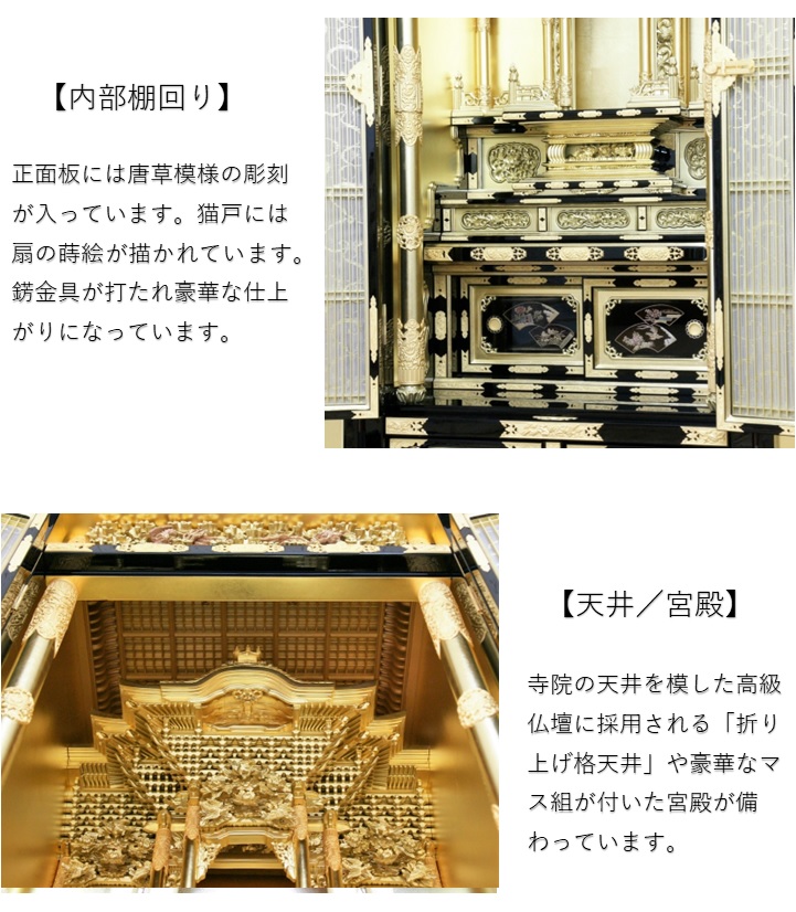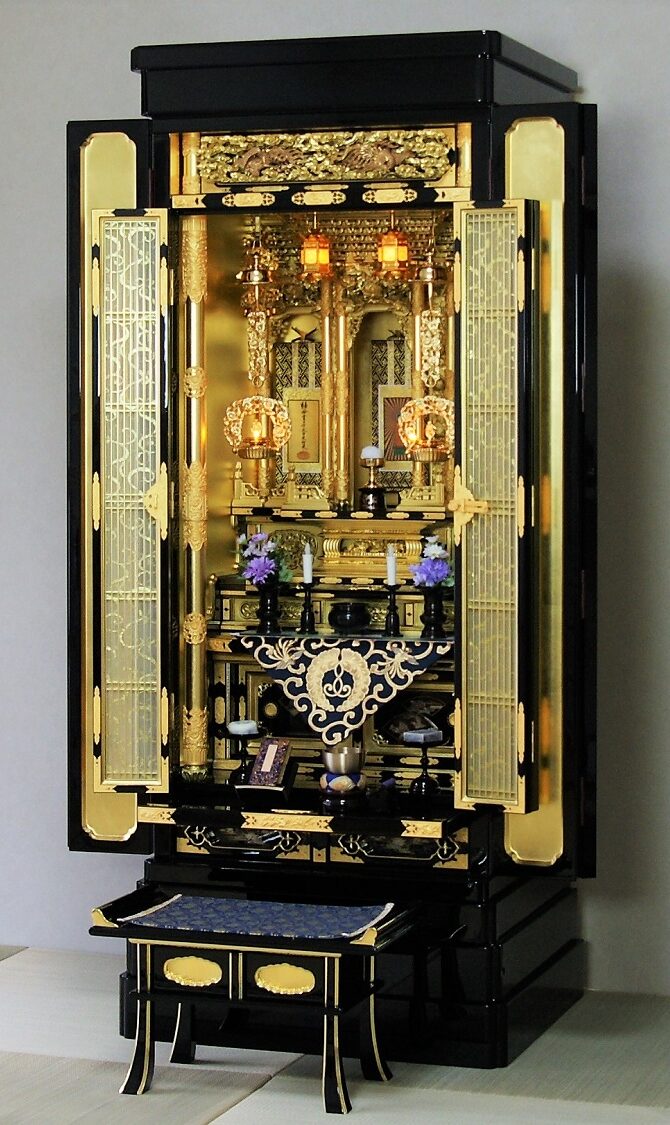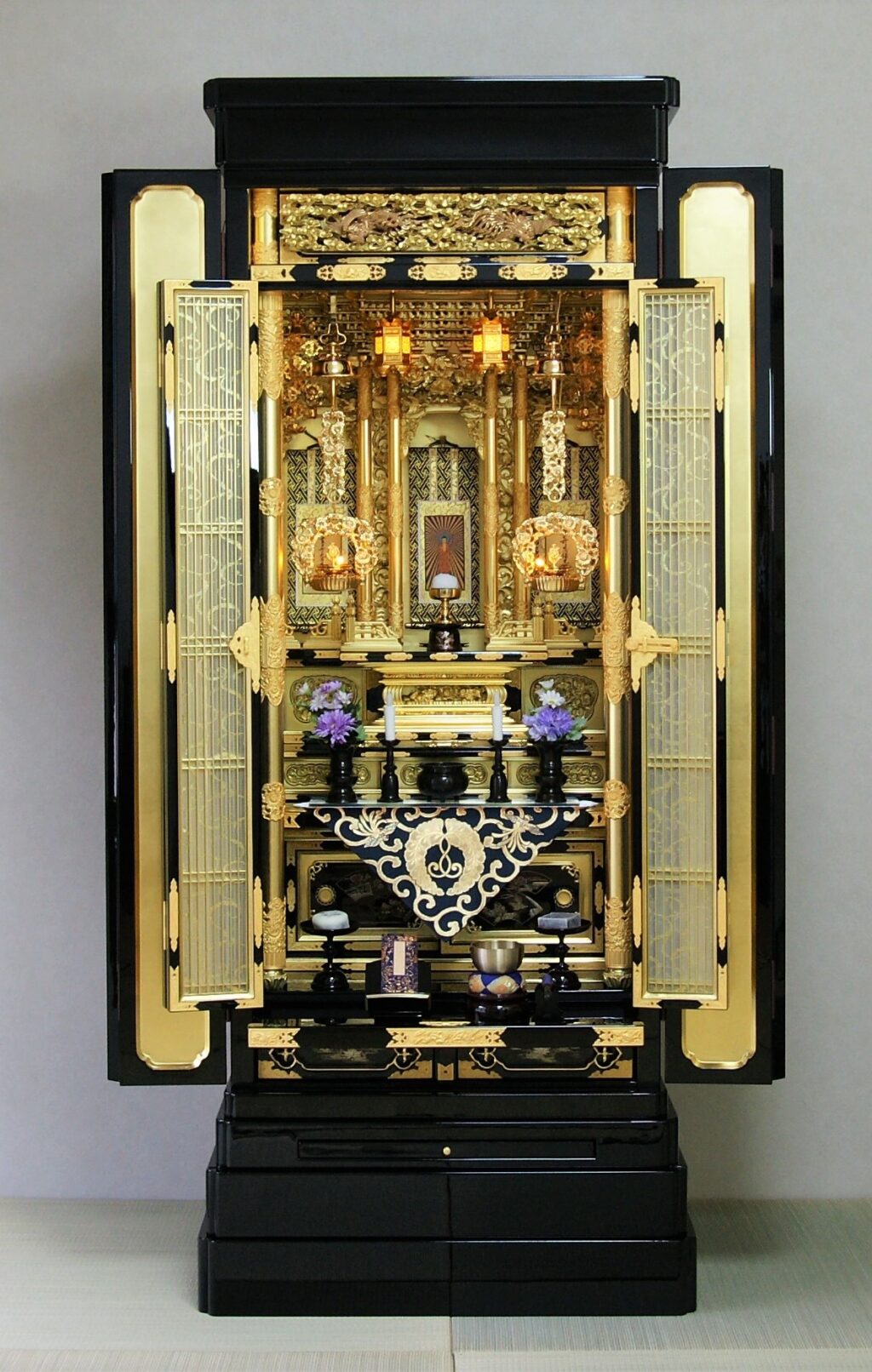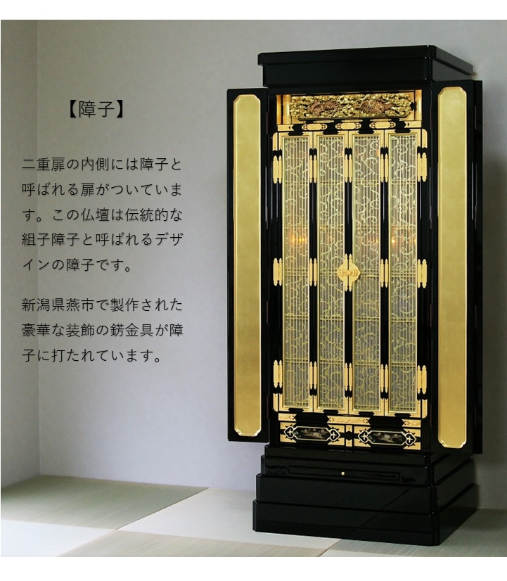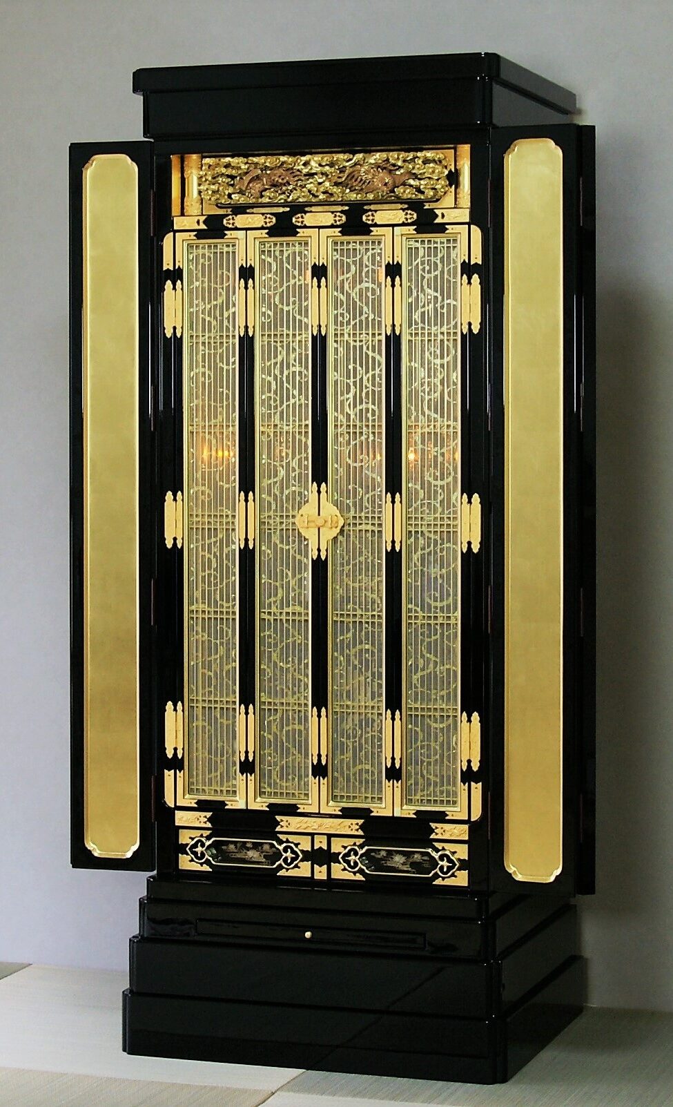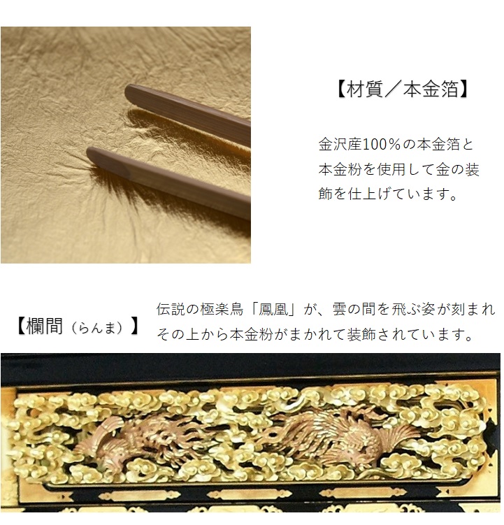 伝統技術で製作された京型の浄土真宗本願寺派(西本願寺)専用の金仏壇です。光沢感のある漆黒のカシュー塗りで仕上げられ、金沢産100%の本金箔が仏壇内部に施され豪華な輝きと共に圧倒的な存在感を誇ります。戸袋の正面板には扇の図柄が伝統技法【蒔絵】で美しく描かれています。仏壇の顔ともいえる欄間(ランマ)の彫りは極楽に住むといわれる伝説の極楽鳥『鳳凰』が雲の中を羽ばたいているデザインが刻まれていて阿弥陀如来がおられる極楽浄土の空を表しています。