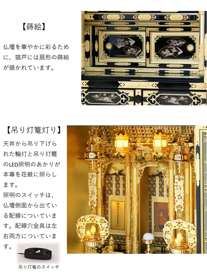 ご本尊が安置される手前に吊り灯篭1対輪灯1対が吊り下げられ合計4個のLED照明の灯りが仏壇内部を幻想的に照らします。LED照明は「発熱しない」「電球が長寿命」「省エネ設計」で紫外線を出さないためまわりの素材が経年劣化しにくいという特徴があります。電源の切り替えの手元スイッチは仏壇の側面から出る配線についています。