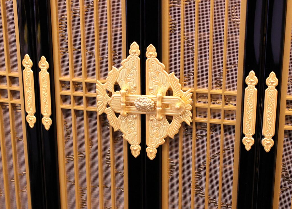 仏壇内部や柱に装飾用の厚みのある真鍮製の飾り金具が打ち込まれ豪華さを演出しています。外側の扉には京型金仏壇独特の京色と呼ばれるエンジ色に焼付塗装された真鍮金具が打たれています。内側扉には本金消しメッキ塗装された上品な色合いの八双型金具が打たれています。