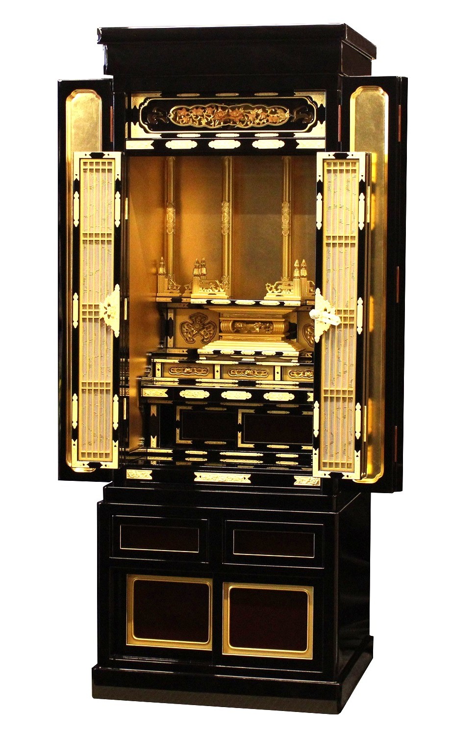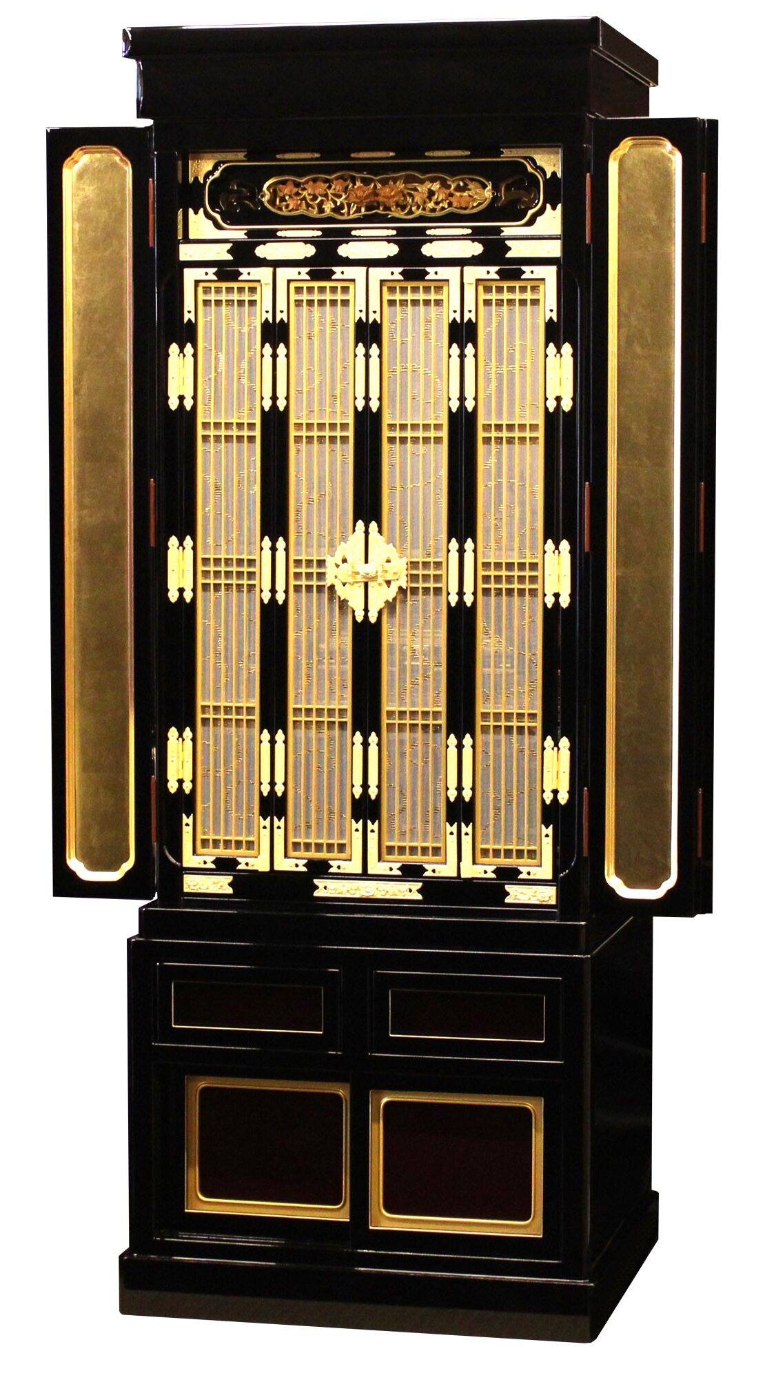 小型の床置き型西本願寺、興正寺専用の金仏壇です。高級感のある漆黒のカシュー塗りで仕上げられ、金沢産100%の本金箔が仏壇内部に施され豪華な輝きと共に圧倒的な存在感を誇ります。下台の正面板は落ち着いた色合いの溜塗で上品に仕上げられています。仏壇の顔ともいえる欄間(ランマ)の彫りは牡丹の図柄が細部まで職人の手で彫り上げられています。