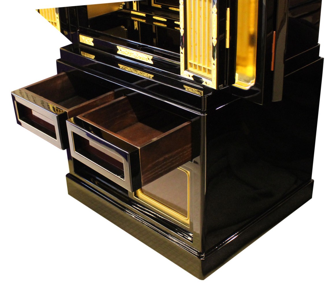 ・仏壇の下台部分に二個の引き出しと戸袋の奥に収納スペースがついています。