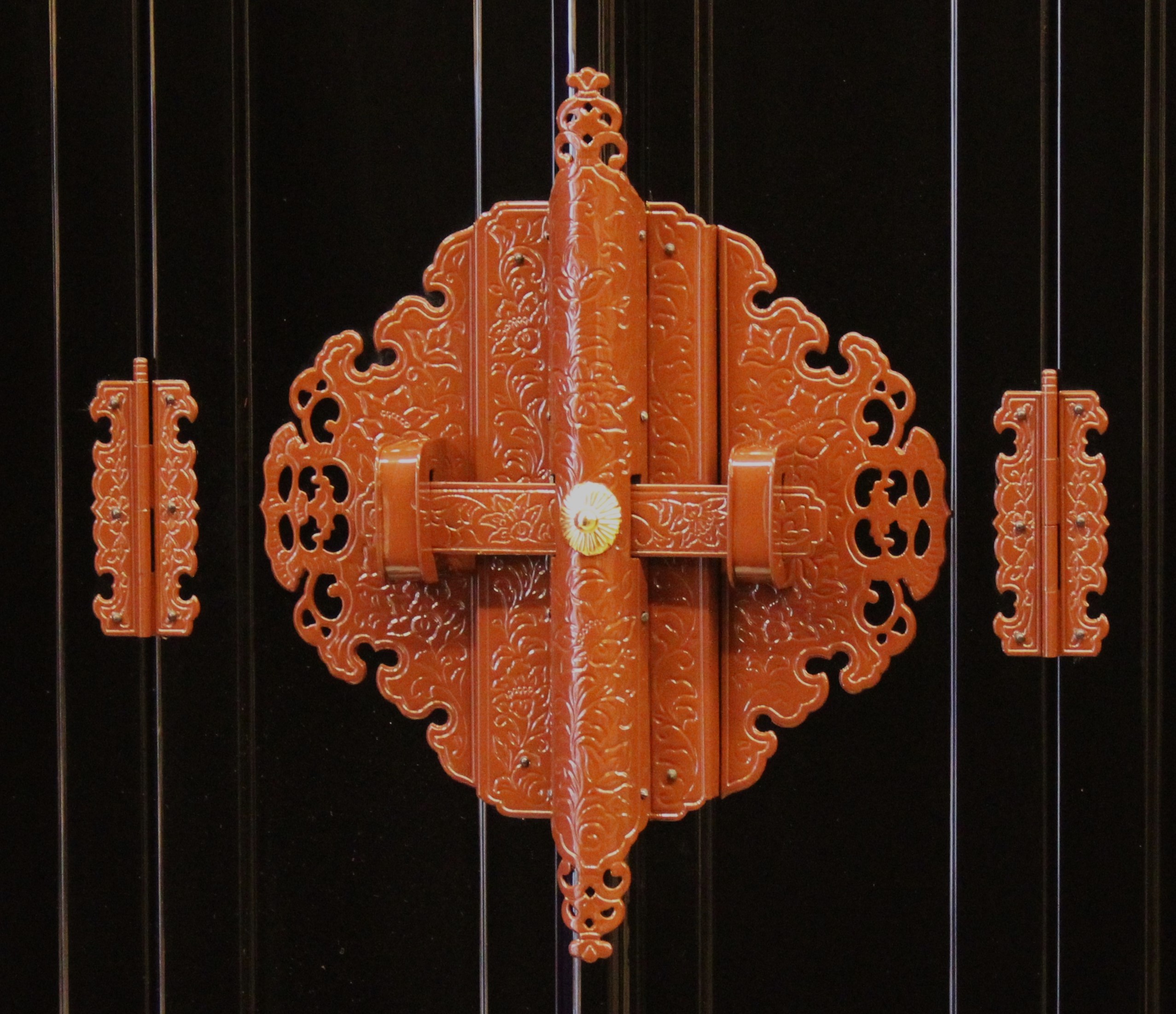 仏壇内部や柱に装飾用の厚みのある真鍮製の飾り金具が打ち込まれ豪華さを演出しています。外側の扉には京型金仏壇独特の京色と呼ばれるエンジ色に焼付塗装された真鍮金具が打たれています。内側扉には本金消しメッキ塗装された上品な色合いの八双型金具が打たれています。