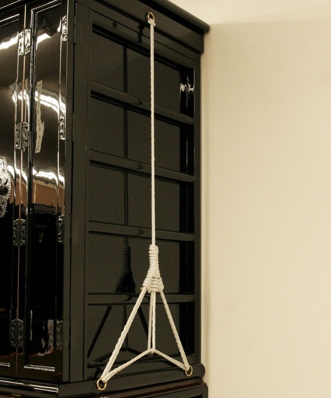仏壇の外側両側面には組紐のように化粧された白い紐が仏壇の胴体の上下をつないでいます。お化粧という飾りの意味もあるこの紐は仏壇設置後、外すものではなく仏壇の上部と下部の胴(本体)を紐で締めて固める役割もしています。