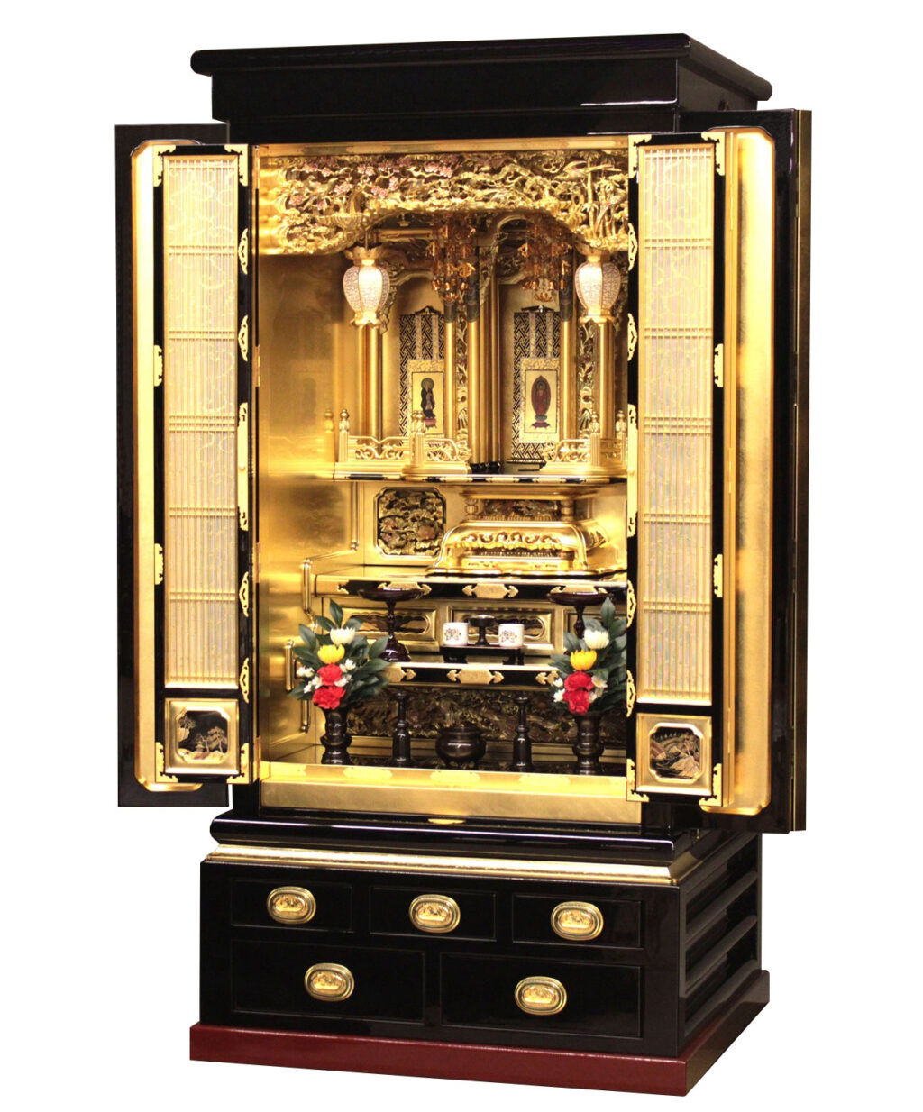 昔ながらの伝統技術を使って製作された浄土宗・融通念仏宗・真言宗・曹洞宗・天台宗・日蓮宗・禅宗用の大阪型金仏壇です。高級感のある漆黒のカシュー漆塗りで仕上げられ、金沢産100%の本金箔と本金紛が仏壇内部に施され豪華な輝きと共に圧倒的な存在感を誇ります。下段奥にはめ込まれている花鳥彫りの彫り物の奥に前面本金箔がほどこされた隠し引き出しが備え付けられています。可動式の仏具板(前引き)には山水の図柄が伝統技法【蒔絵】で美しく描かれています。仏壇の顔ともいえる欄間(ランマ)の彫りは『花鳥』のデザインが細かく刻まれ彩色が施されています。引き出しの裏にまで込み入った細工がされた伝統技術が詰め込まれた本格派の金仏壇です。