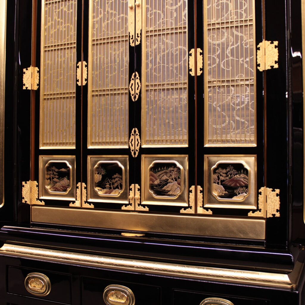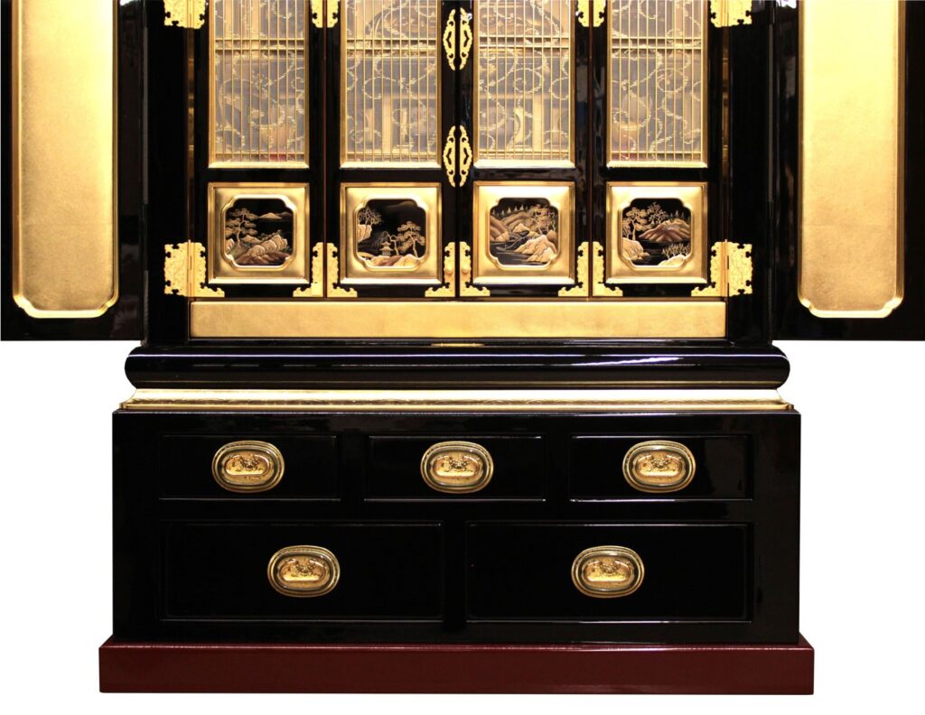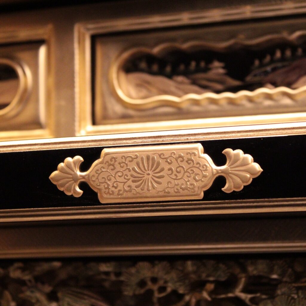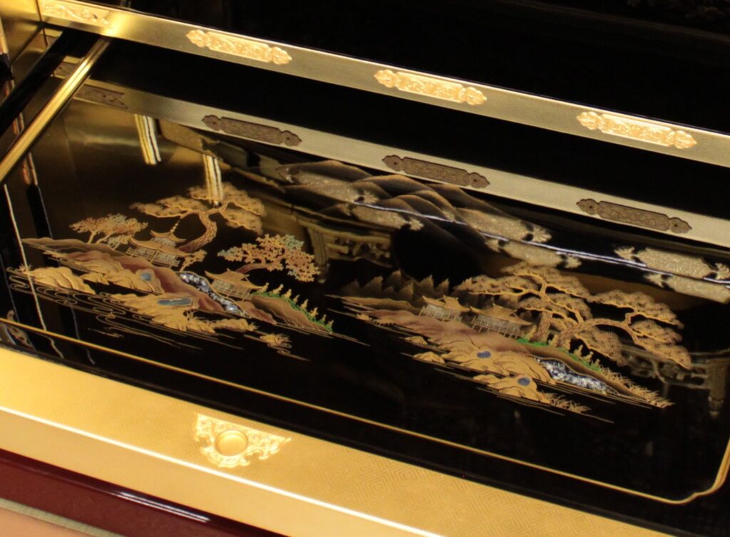 仏壇の色々な部分に伝統技法【蒔絵】が施され一つ一つ職人の手で細部まで描かれています。可動式仏具板(前引き)には山水画が描かれ、下台の五つの引き出しの裏には蓮の図柄が繊細に描かれています。