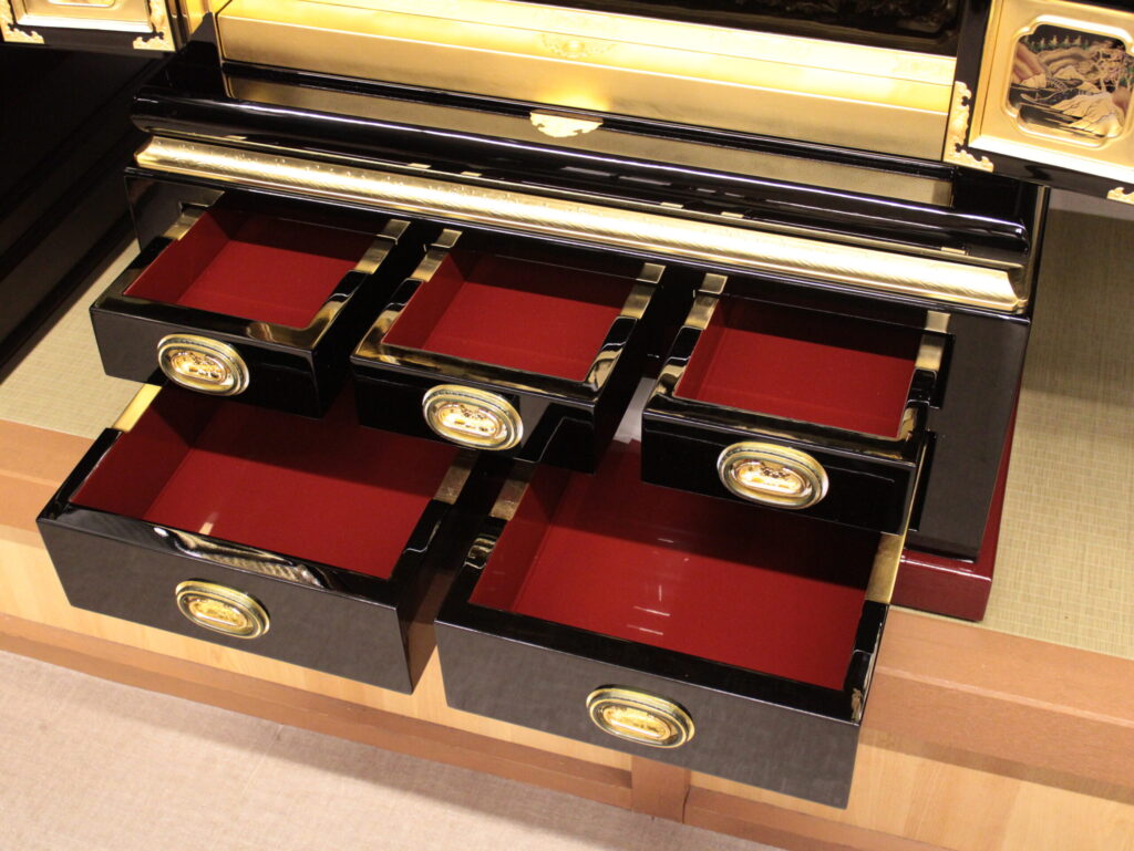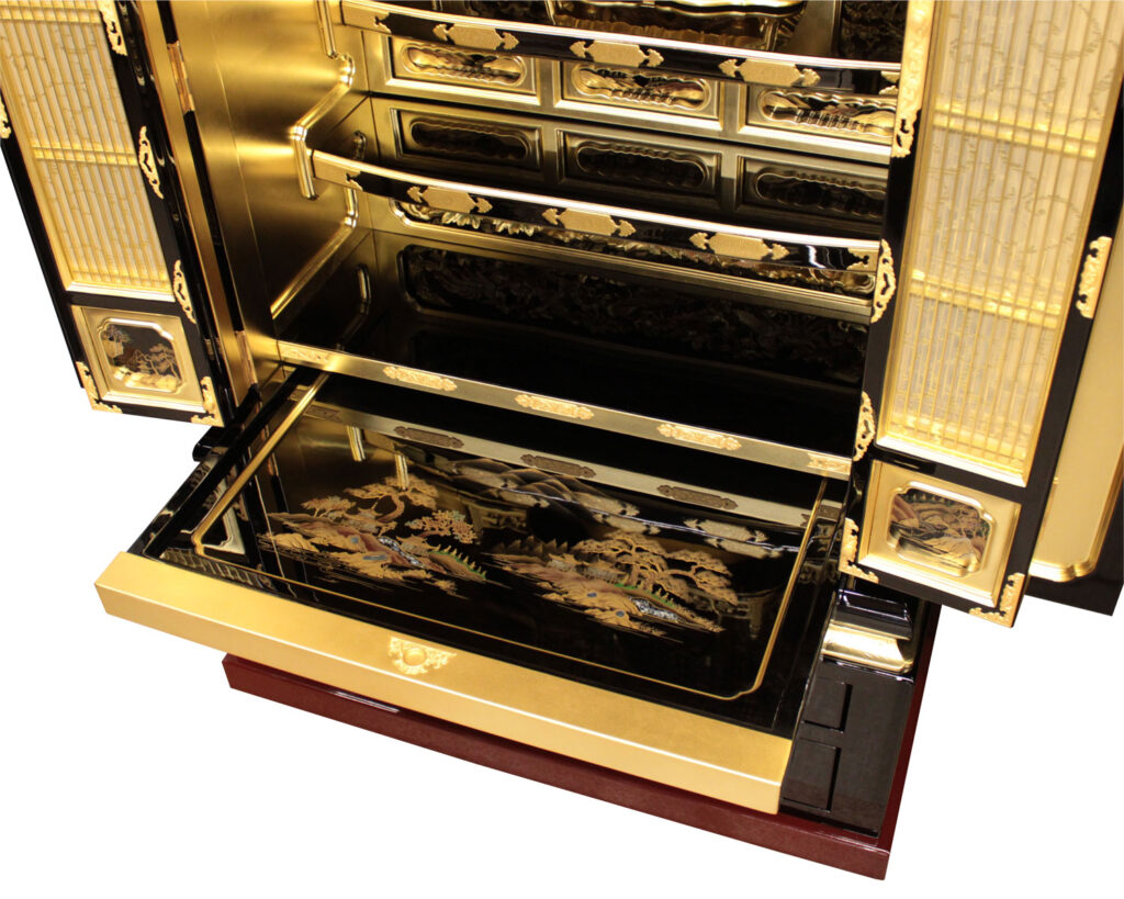 ・5杯引き出しの裏面には豪華な蓮の蒔絵が5杯とも描かれています。引き出しの枠は黒塗りで仕上げ、一段下がった面を紅溜め塗りで仕上げ縁に本金箔が施されています。大阪型金仏壇のみの最高級の仕上げになります。