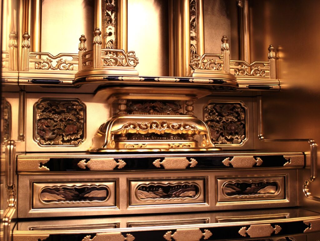 仏壇内部の屋根や柱は宮殿(くうでん)と呼ばれ一重破風屋根と本金箔張りの柱で寺院の本堂を模して造られそこに阿弥陀如来が安置されます。