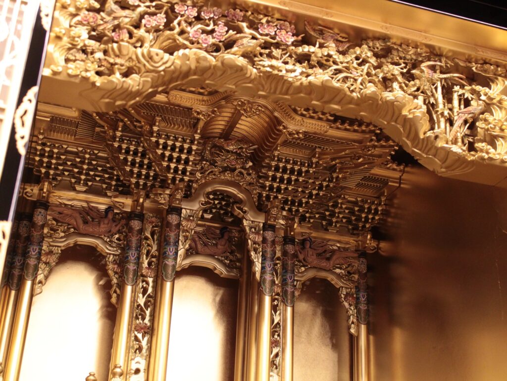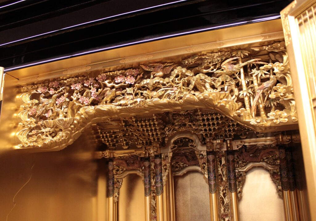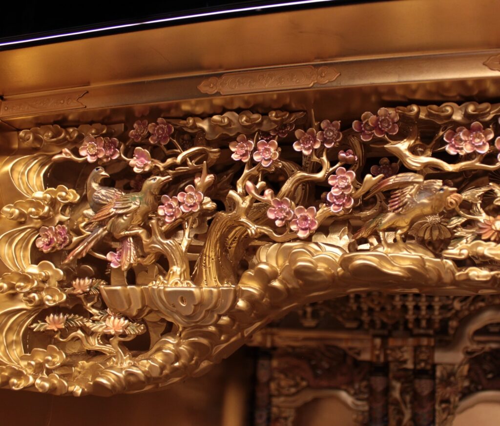 須弥壇の両サイドには花鳥図柄の彫刻が刻まれ金粉と彩色が施されています。