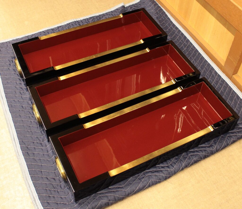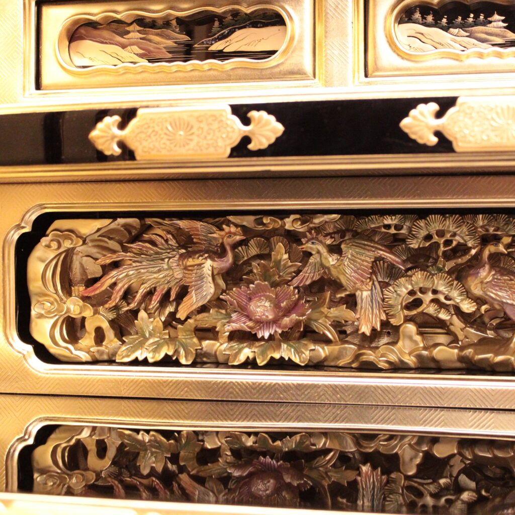 ・引き出しの枠は黒塗りで中央部分のみ少し下げて本金箔の加飾が施されています。内側は紅溜め塗りで仕上げられています。