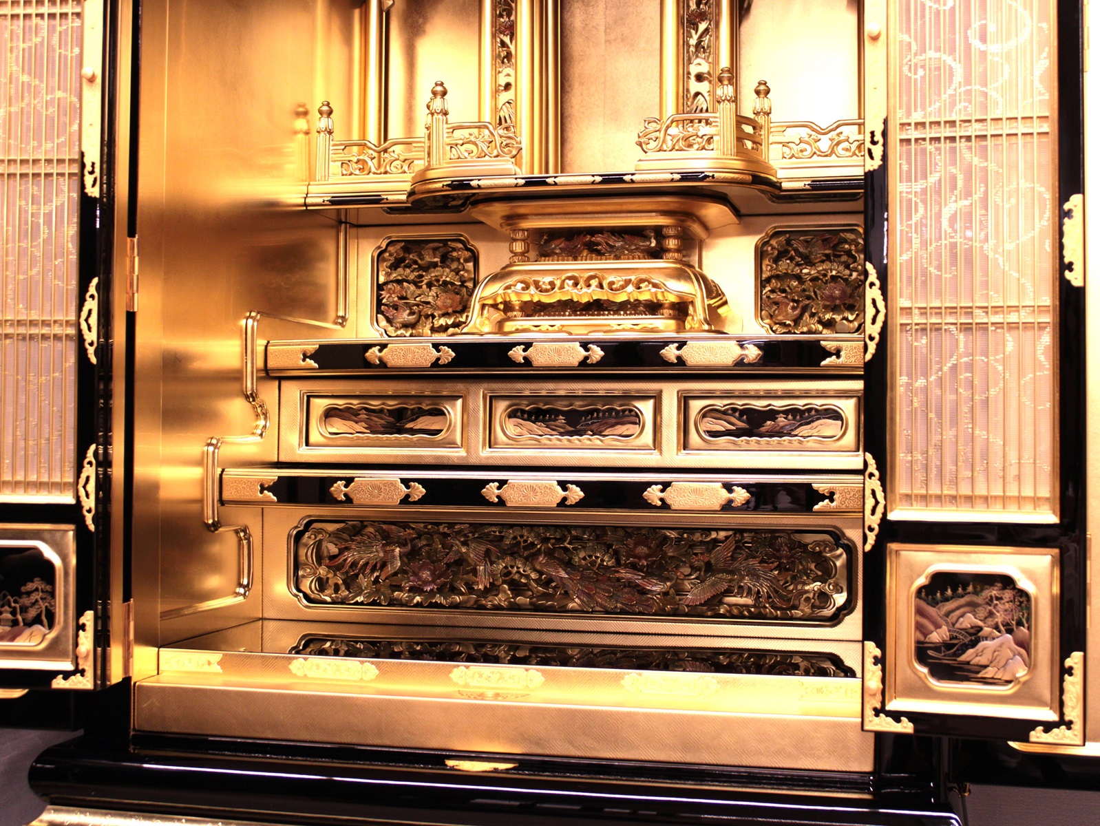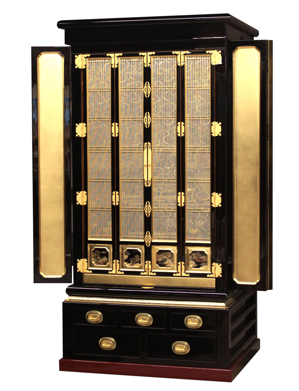昔ながらの伝統技術を使って製作された浄土宗・融通念仏宗・真言宗・曹洞宗・天台宗・日蓮宗・禅宗用の大阪型金仏壇です。高級感のある漆黒のカシュー漆塗りで仕上げられ、金沢産100%の本金箔と本金紛が仏壇内部に施され豪華な輝きと共に圧倒的な存在感を誇ります。下段奥にはめ込まれている花鳥彫りの彫り物の奥に前面本金箔がほどこされた隠し引き出しが備え付けられています。可動式の仏具板(前引き)には山水の図柄が伝統技法【蒔絵】で美しく描かれています。仏壇の顔ともいえる欄間(ランマ)の彫りは『花鳥』のデザインが細かく刻まれ彩色が施されています。引き出しの裏にまで込み入った細工がされた伝統技術が詰め込まれた本格派の金仏壇です。