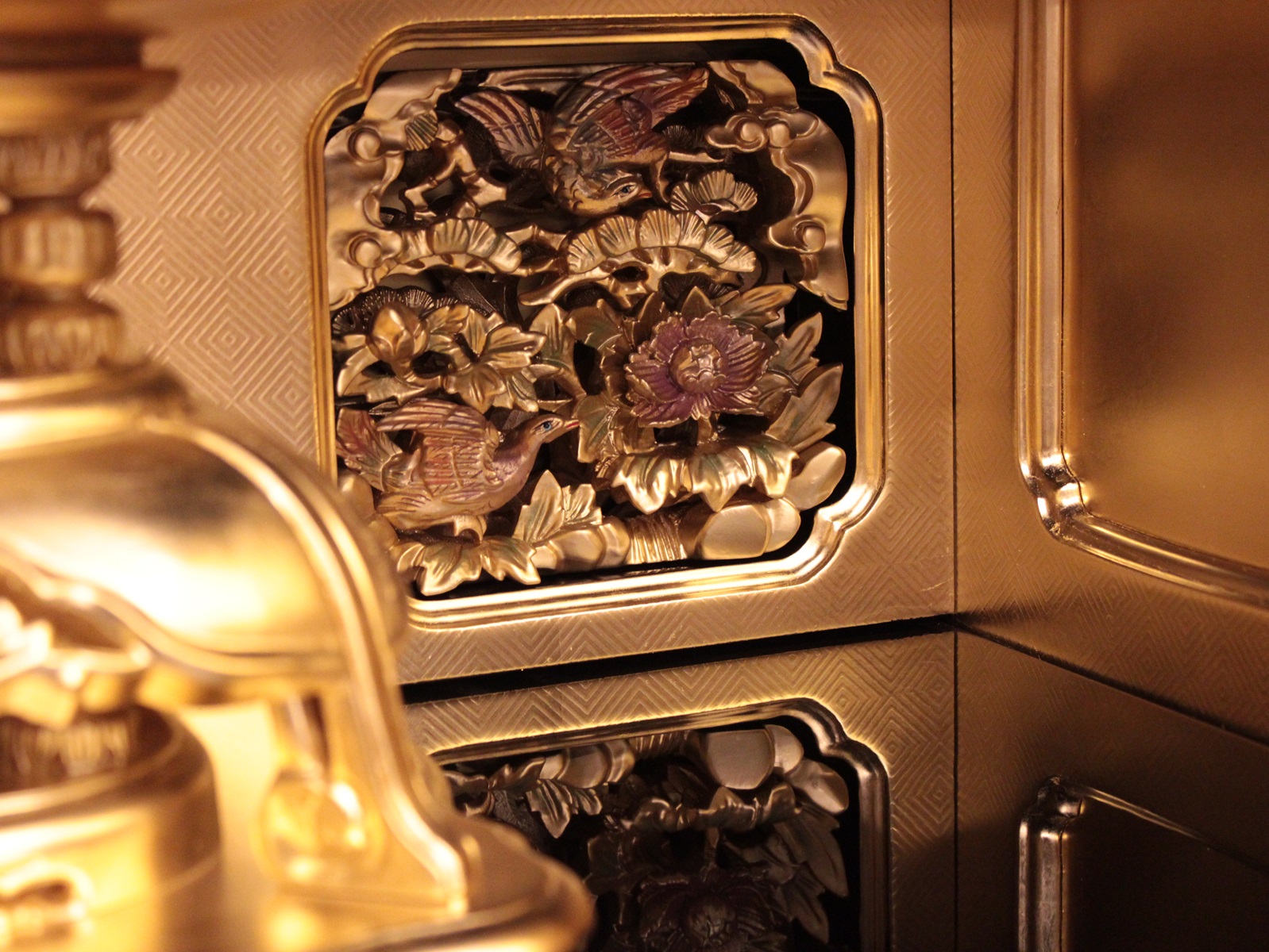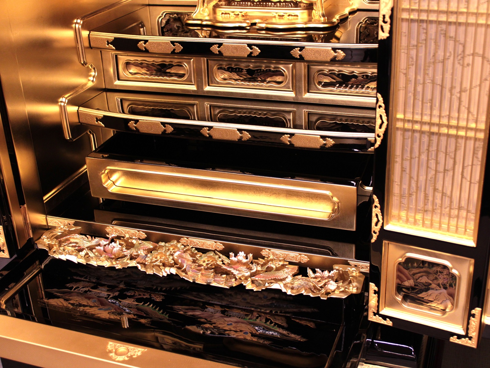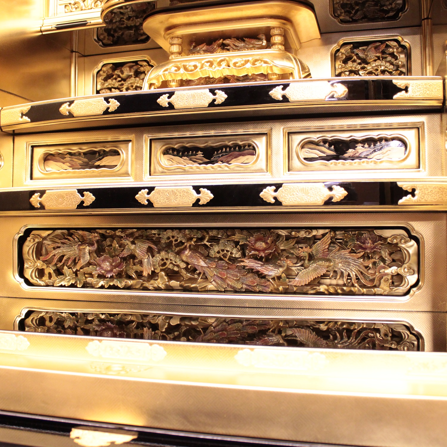 下段奥に高級仏壇にのみ使われる花鳥模様のデザインの厚みのあるケコミ彫りといわれる木彫り彫刻がはめ込み式になって備えられています。その奥に正面が本金箔、本金紛で覆われた引き出しが隠されています。
