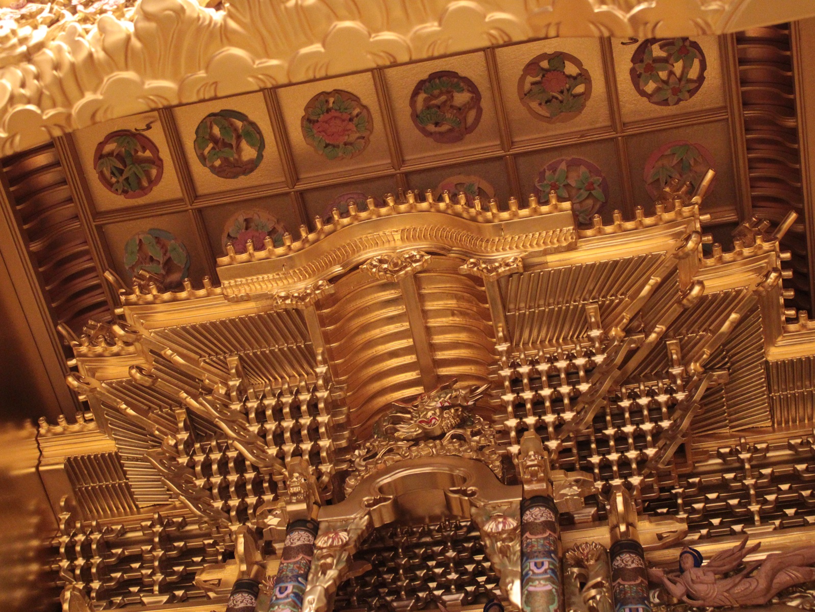 仏壇内部の屋根や柱は宮殿(くうでん)と呼ばれ一重破風屋根と本金箔張りの柱で寺院の本堂を模して造られそこに阿弥陀如来が安置されます。