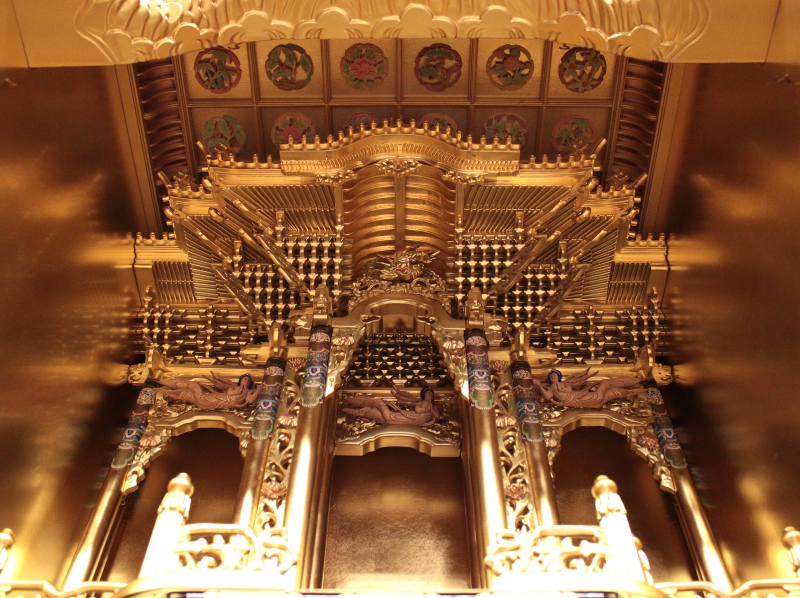 ご本尊を安置する壇の下は須弥壇と呼ばれ極楽浄土の世界を表すデザインが施されています。