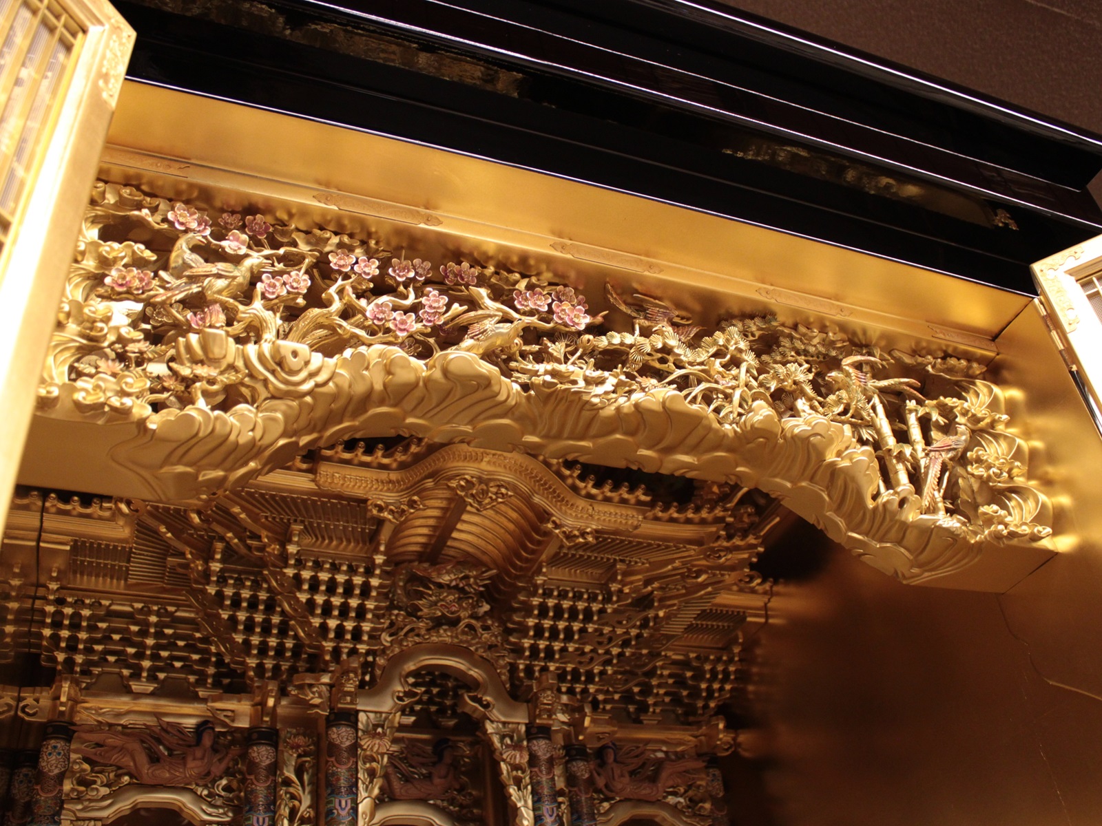 須弥壇の両サイドには花鳥図柄の彫刻が刻まれ金粉と彩色が施されています。