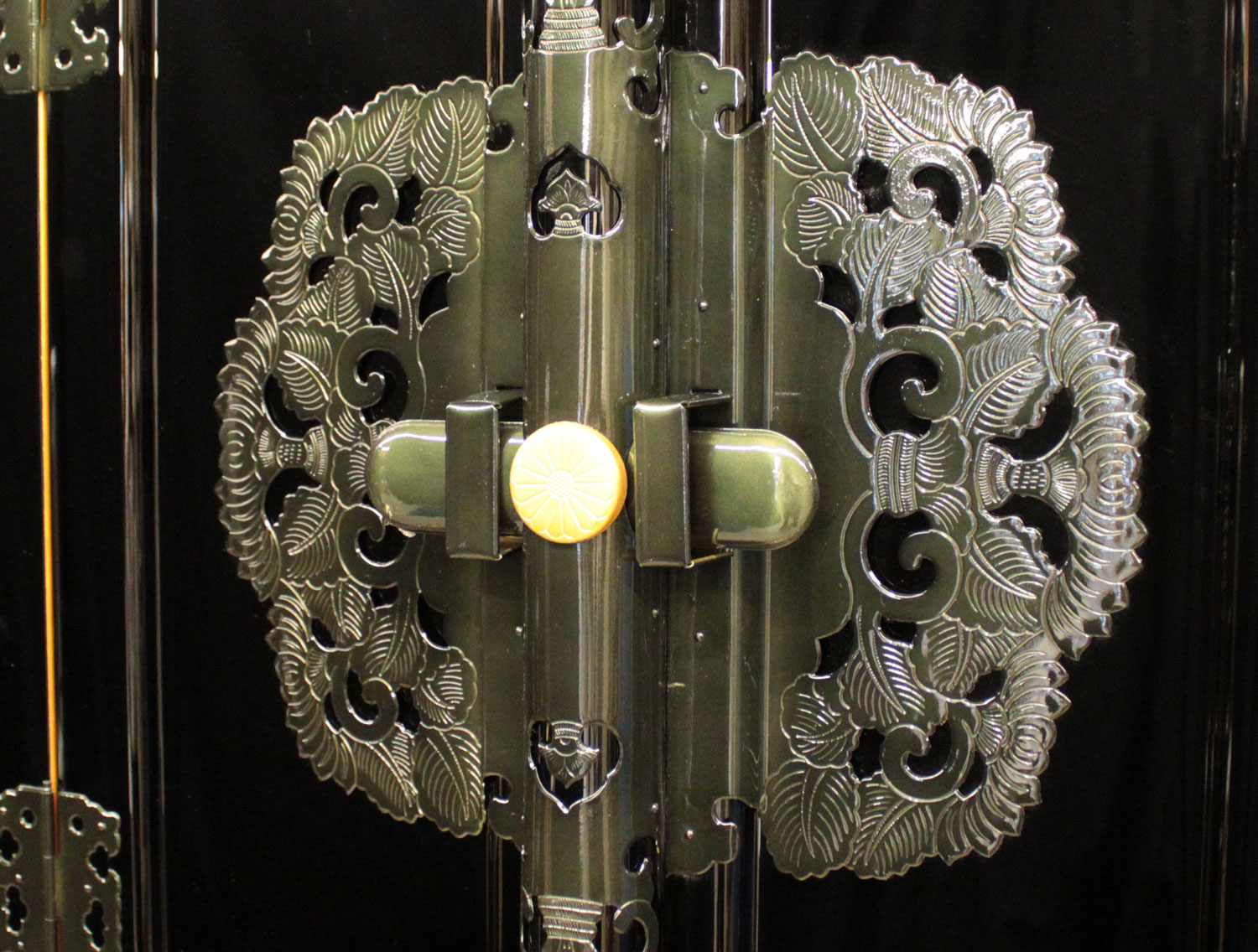 ・外側の正面扉の大阪型金仏壇独特の緑宣徳(みどりせんとく)と呼ばれる深緑色に着色し焼付塗装された真鍮金具