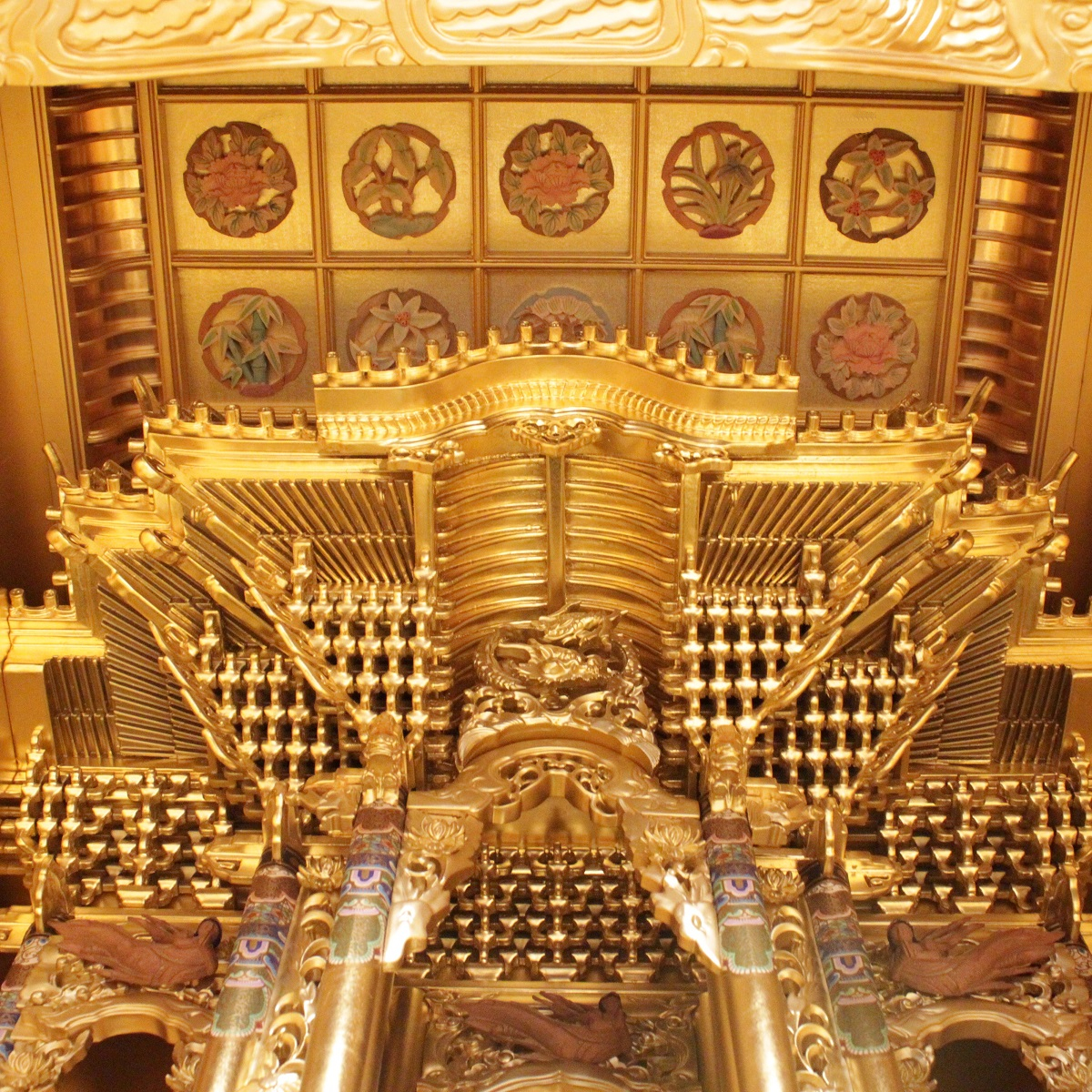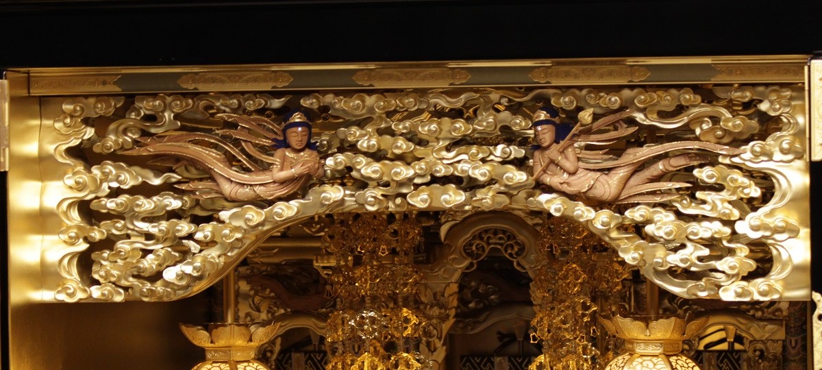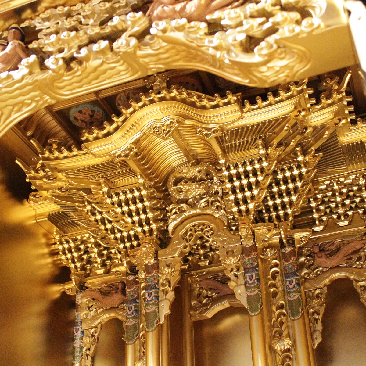 仏壇内部の屋根や柱は宮殿(くうでん)と呼ばれ一重破風屋根と本金箔張りの柱で寺院の本堂を模して造られそこに阿弥陀如来が安置されます。