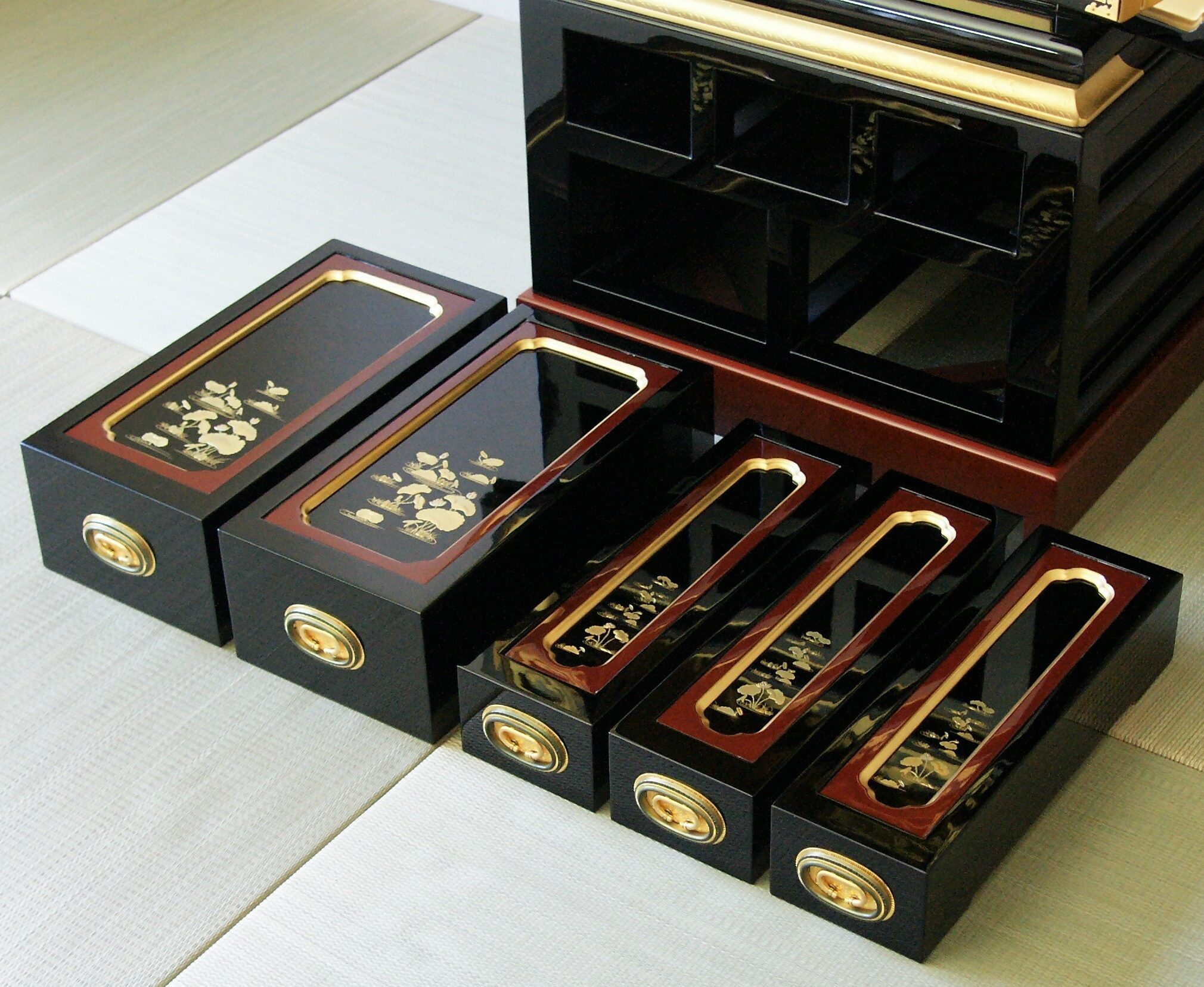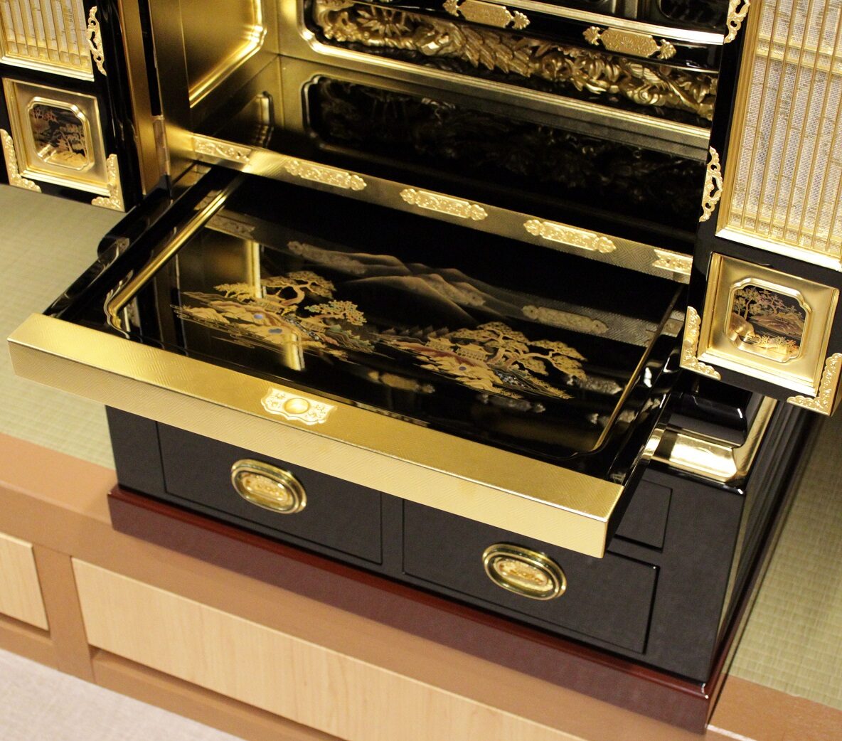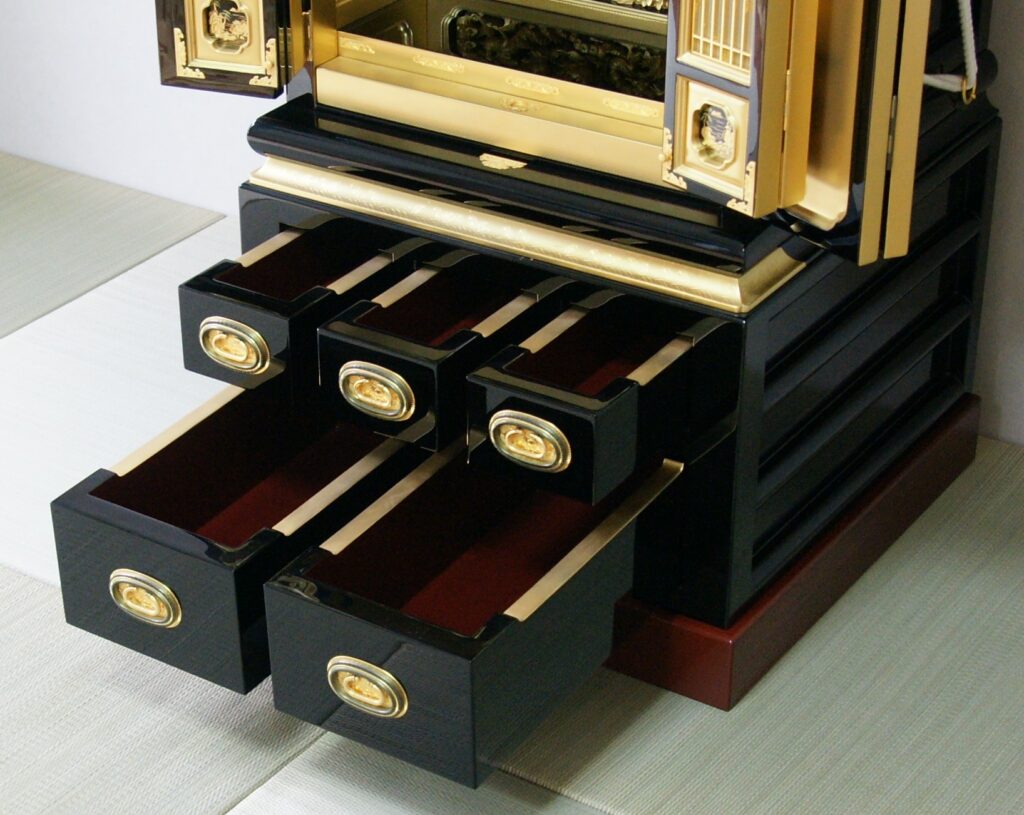 ・仏壇の下台部分に五個の引き出しがついていて仏具小物がたくさん収納できます。引き出しの枠の上面は本金箔がほどこされています。引き出しの内側は紅溜塗りに仕上げられています。
