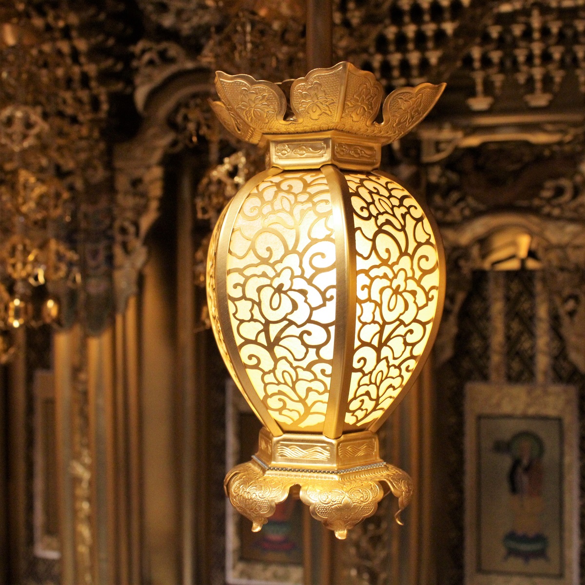 ・天井から吊り下げられた吊灯篭(とうろう)は、寺院で使われている吊り灯篭の縮小サイズのものが使われています。