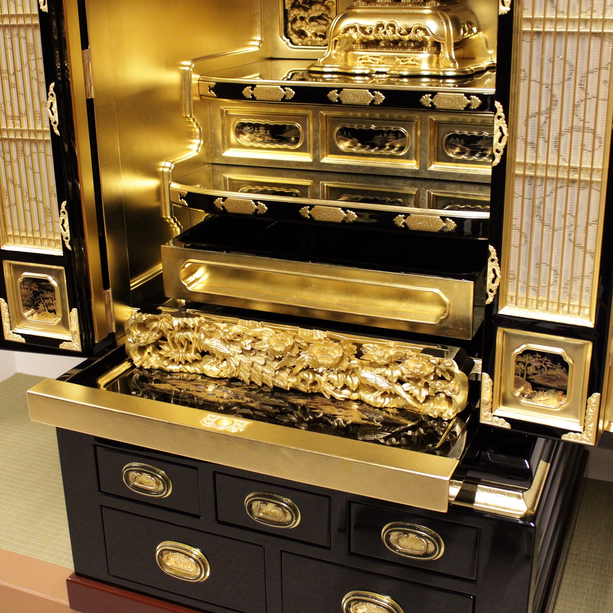 下段奥に高級仏壇にのみ使われる花鳥模様のデザインの厚みのあるケコミ彫りといわれる木彫り彫刻が、はめ込み式になって備えられています。その奥に正面が本金箔、本金紛で覆われた引き出しが隠されています。