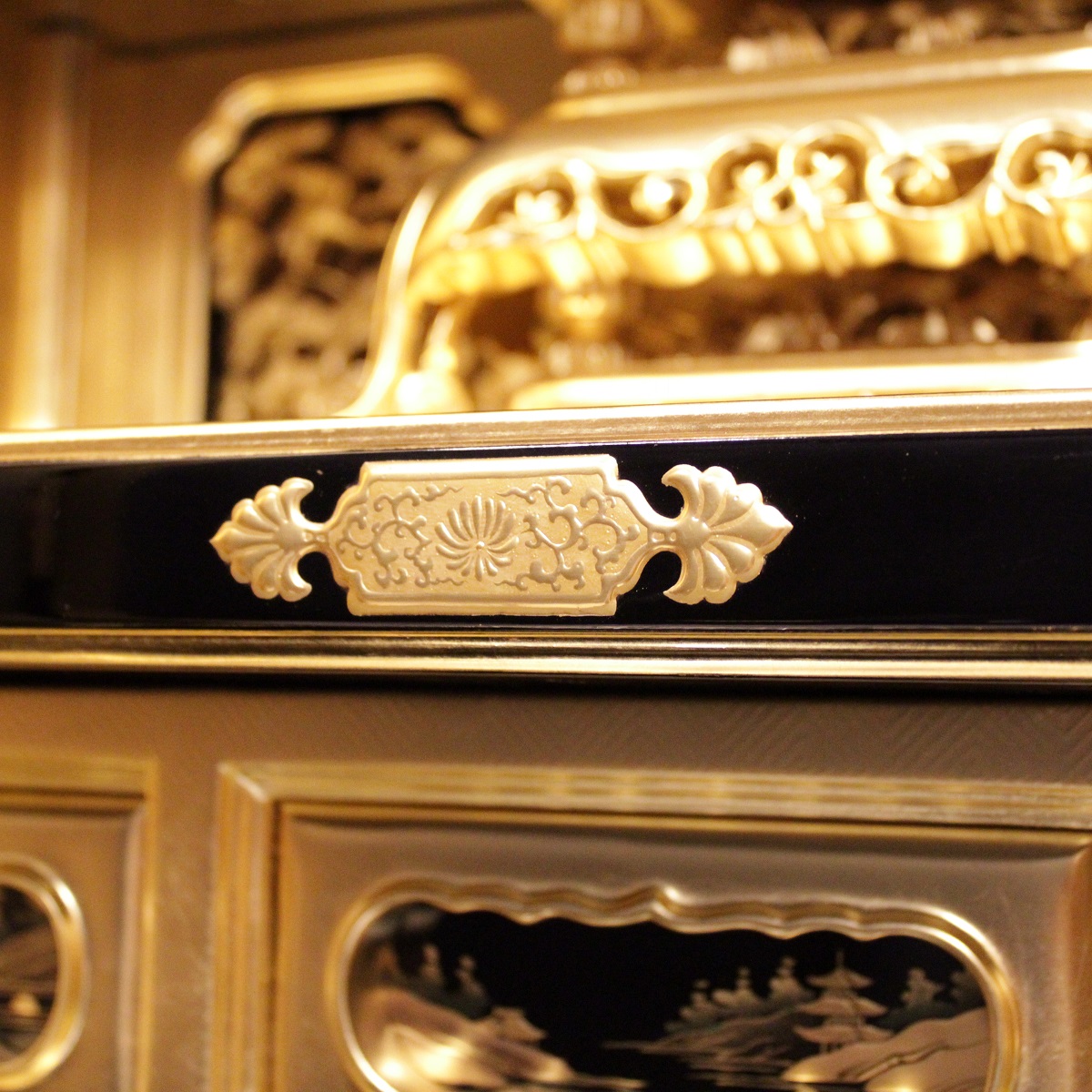 仏壇の色々な部分に伝統技法【蒔絵】が施され一つ一つ職人の手で細部まで描かれています。可動式仏具板(前引き)には山水が描かれ、下台の五つの引き出しの裏には蓮の図柄が繊細に描かれています。仏壇内部の段の正面には金具型にかたどられた模様の上から蒔絵が描かれ大阪型金仏壇独特の金具型蒔絵を表現しています。