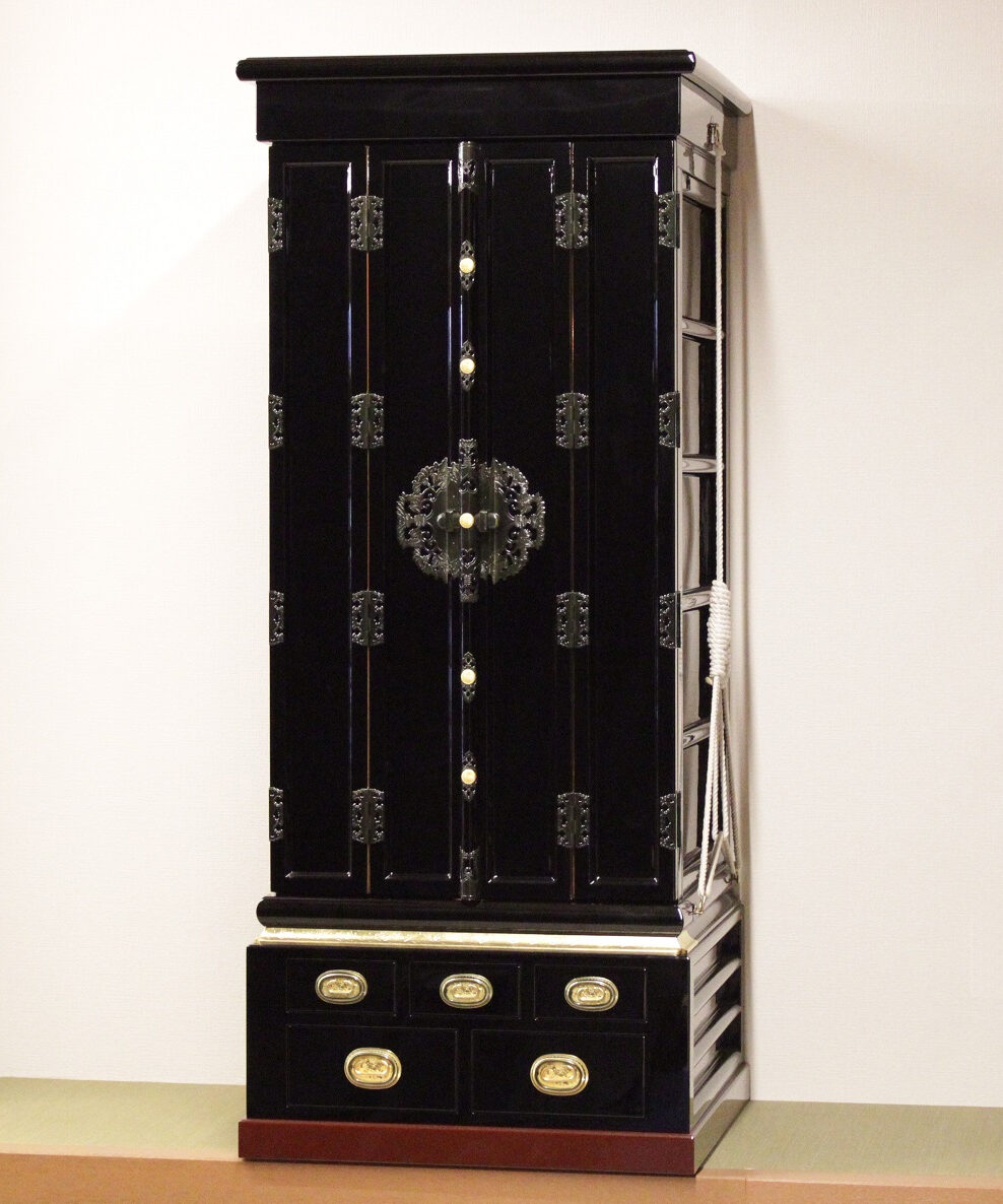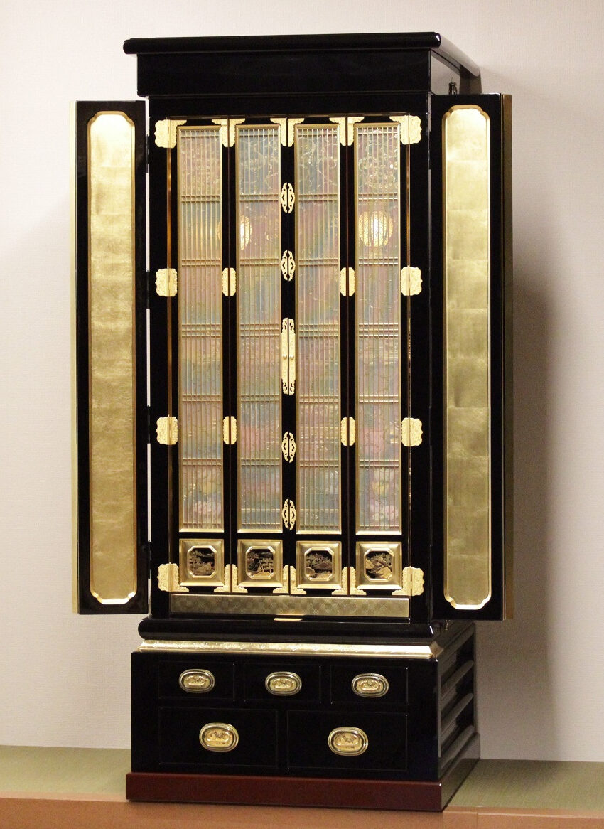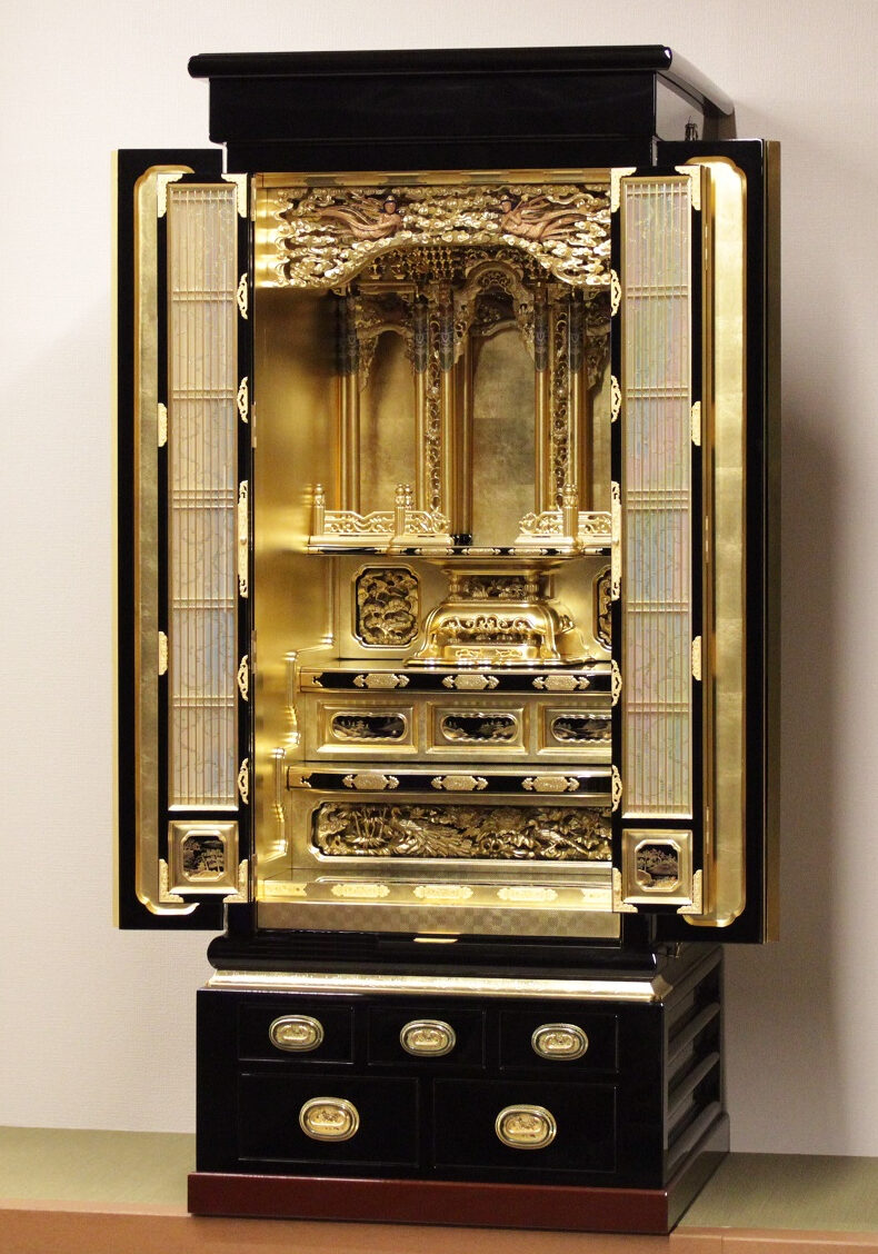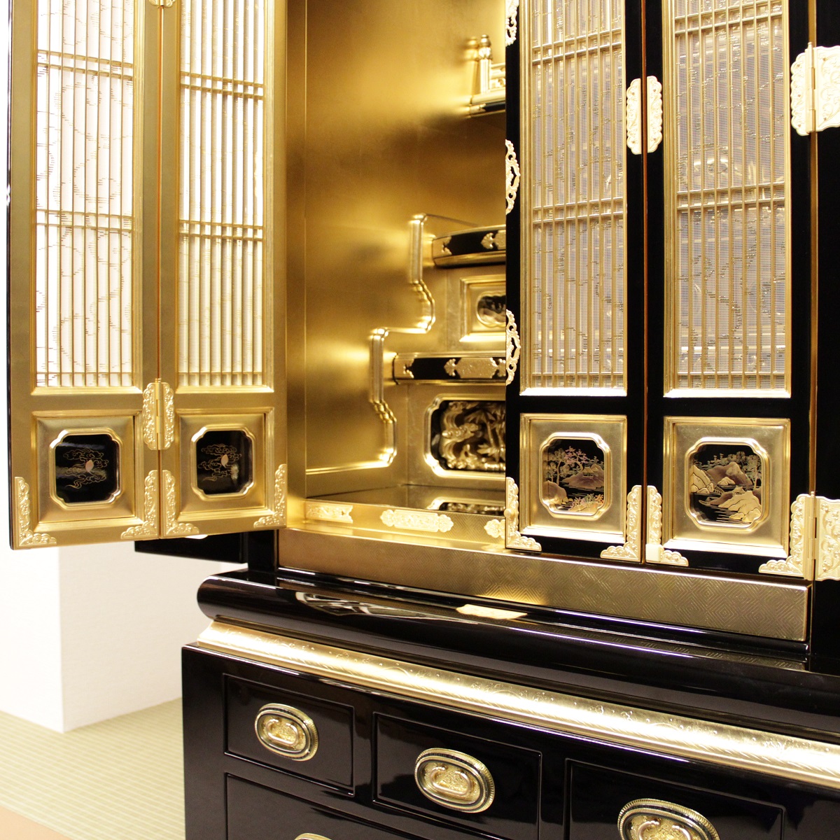昔ながらの伝統技術で製作された浄土宗 融通念仏宗 真言宗 天台宗 曹洞宗 禅宗 日蓮宗用の大阪型金仏壇です。高級感のある漆黒のカシュー漆塗りで仕上げられ、金沢産100%の本金箔と本金紛が仏壇内部に施され豪華な輝きと共に圧倒的な存在感を誇ります。下段奥にはめ込まれている花鳥彫りの彫り物の奥に前面本金箔がほどこされた隠し引き出しが備え付けられています。可動式の仏具板(前引き)には山水の図柄や蓮の図柄が伝統技法【蒔絵】で美しく描かれています。仏壇の顔ともいえる欄間(ランマ)の彫りは二人の天女が雲の中を飛んでいるデザインが刻まれていて阿弥陀如来がおられる極楽浄土の空を表しています。引き出しの裏にまで込み入った細工がされた伝統技術が詰め込まれた本格派の金仏壇です。