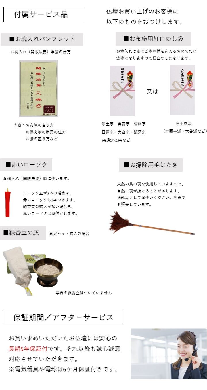 お買い求めいただいたお仏壇には安心の長期5年保証付です。それ以降も誠心誠意対応させていただきます。