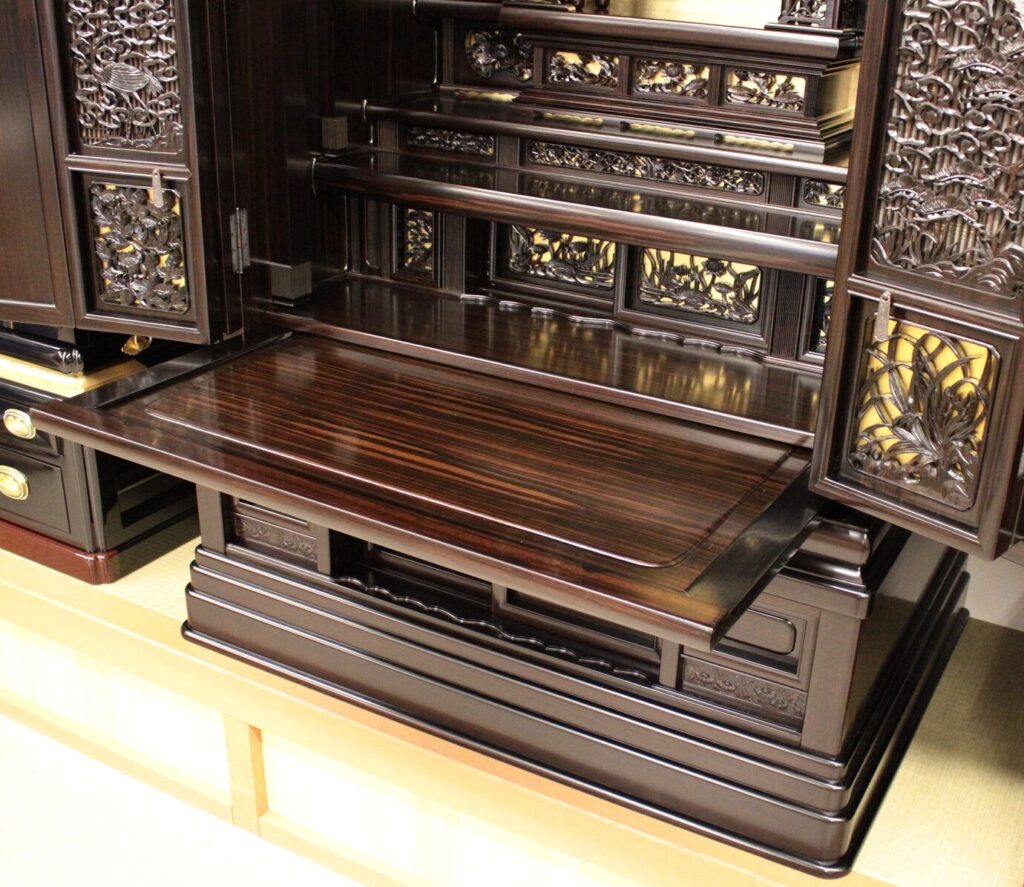 お祀りするのにとても便利なスライド式仏具板がついています。最後まで引くと外れるようになっています。引き出すのは仏具板自体の重量もありますので、全体の半分程度でお願いします。