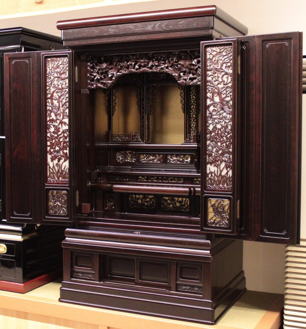 世界三大唐木の一つで木のダイヤモンドともいわれる本黒檀材より貴重な本紫檀材で製作された幅100㎝高さ174㎝の圧巻のサイズの本格派の国産大型本紫檀仏壇です。もう二度と作れない秀逸なお仏壇を激安価格で販売します。高級唐木仏壇の製作で日本一の徳島県で製作されています。高級唐木仏壇だけを作る老舗工場が廃業のために格安で売りに出したので当社がこの価格で販売できることになりました。最後の1基です。大きなお屋敷にお住まいでお部屋も広く仏間も大きい方で立派な仏壇をお探しのお客様におすすめします。ご興味ございましたら一度ご覧ください。