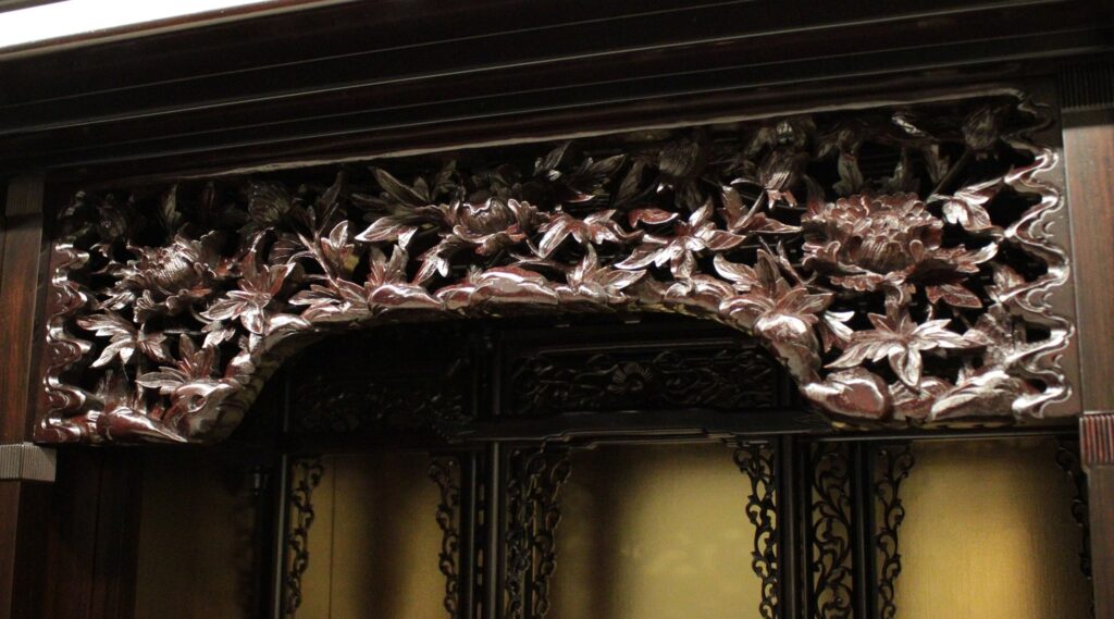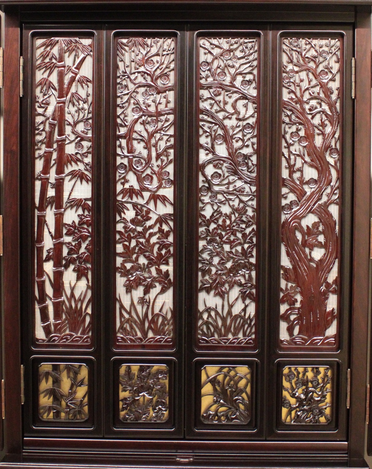 障子に本紫檀材で「四君子図柄」の最高級レベルの本格的な彫刻が施されています。圧倒的な彫刻の作品になっています。