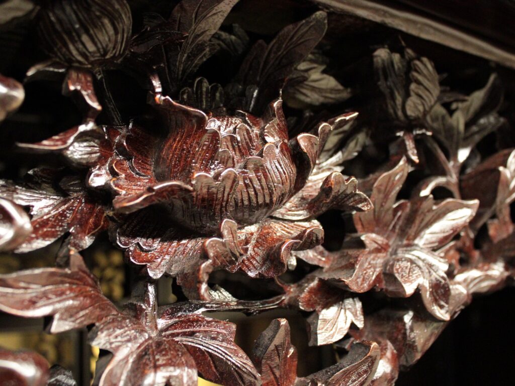 本紫檀材の一刀彫りで刻まれた『牡丹』文様は細かく繊細で圧巻の仕上がりです。現在このサイズが彫刻できる本紫檀材は入手できませんし、職人も引退していますので、最後の最高レベルの彫刻が施された本紫檀材無垢一刀彫欄間になります。