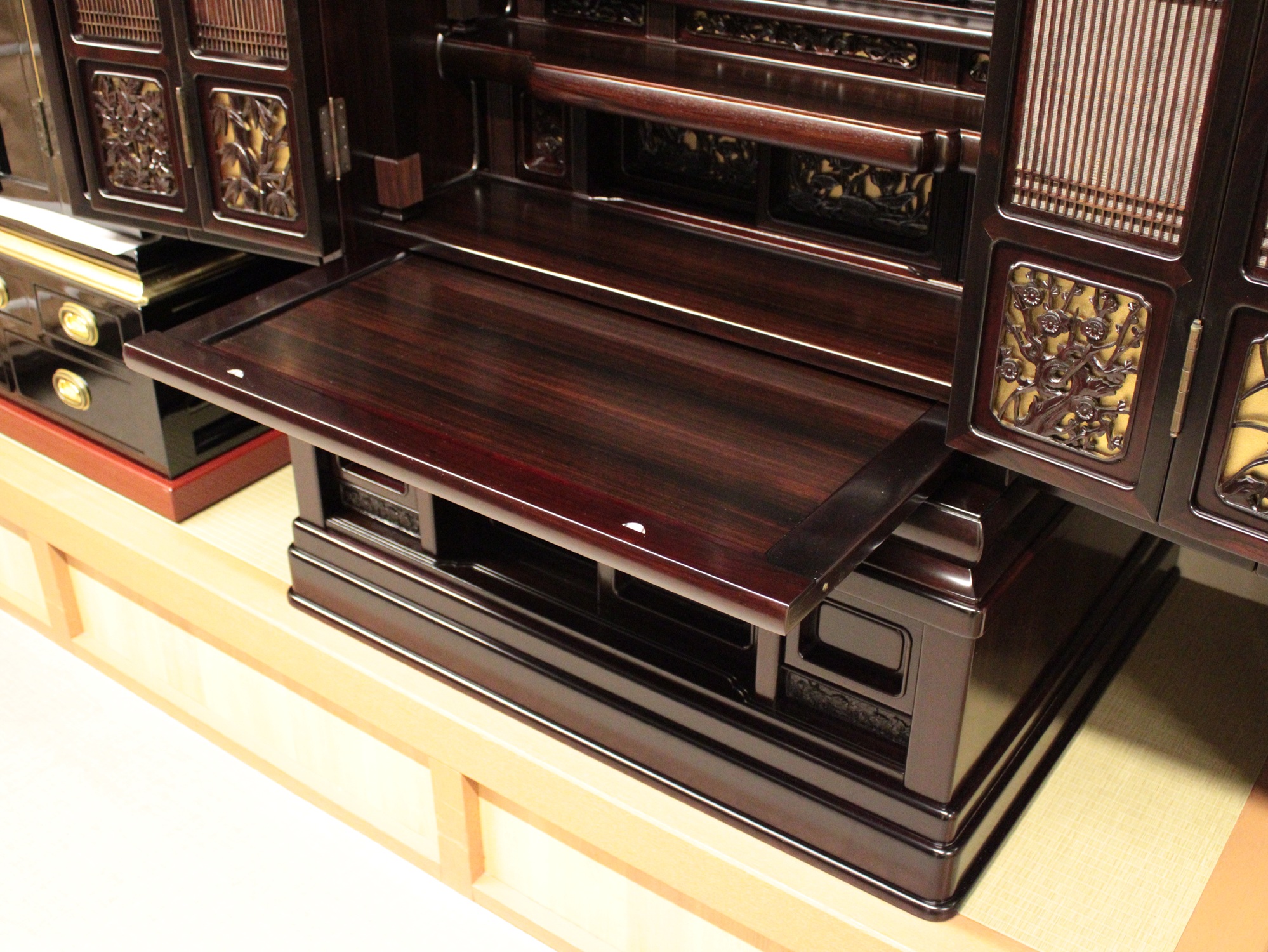 お祀りするのにとても便利なスライド式仏具板がついています。最後まで引くと外れるようになっています。引き出すのは仏具板自体の重量もありますので、全体の半分程度でお願いします。