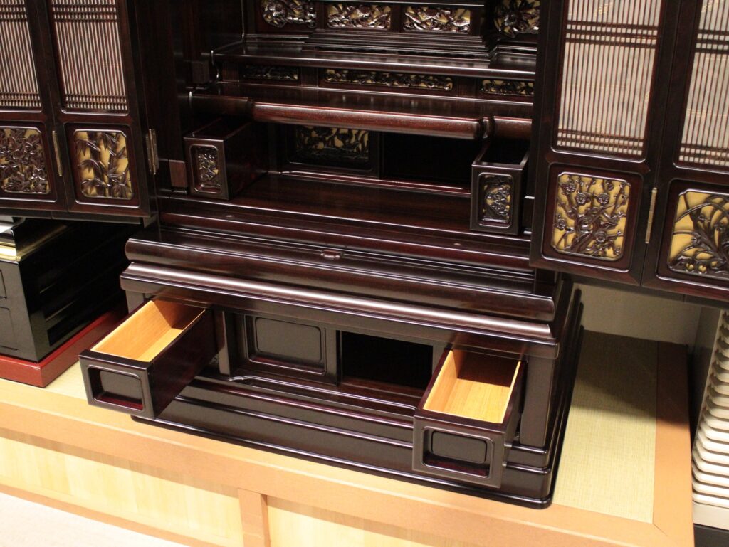 ・仏壇上部の下段奥に引き違い戸と引き出しがあります。