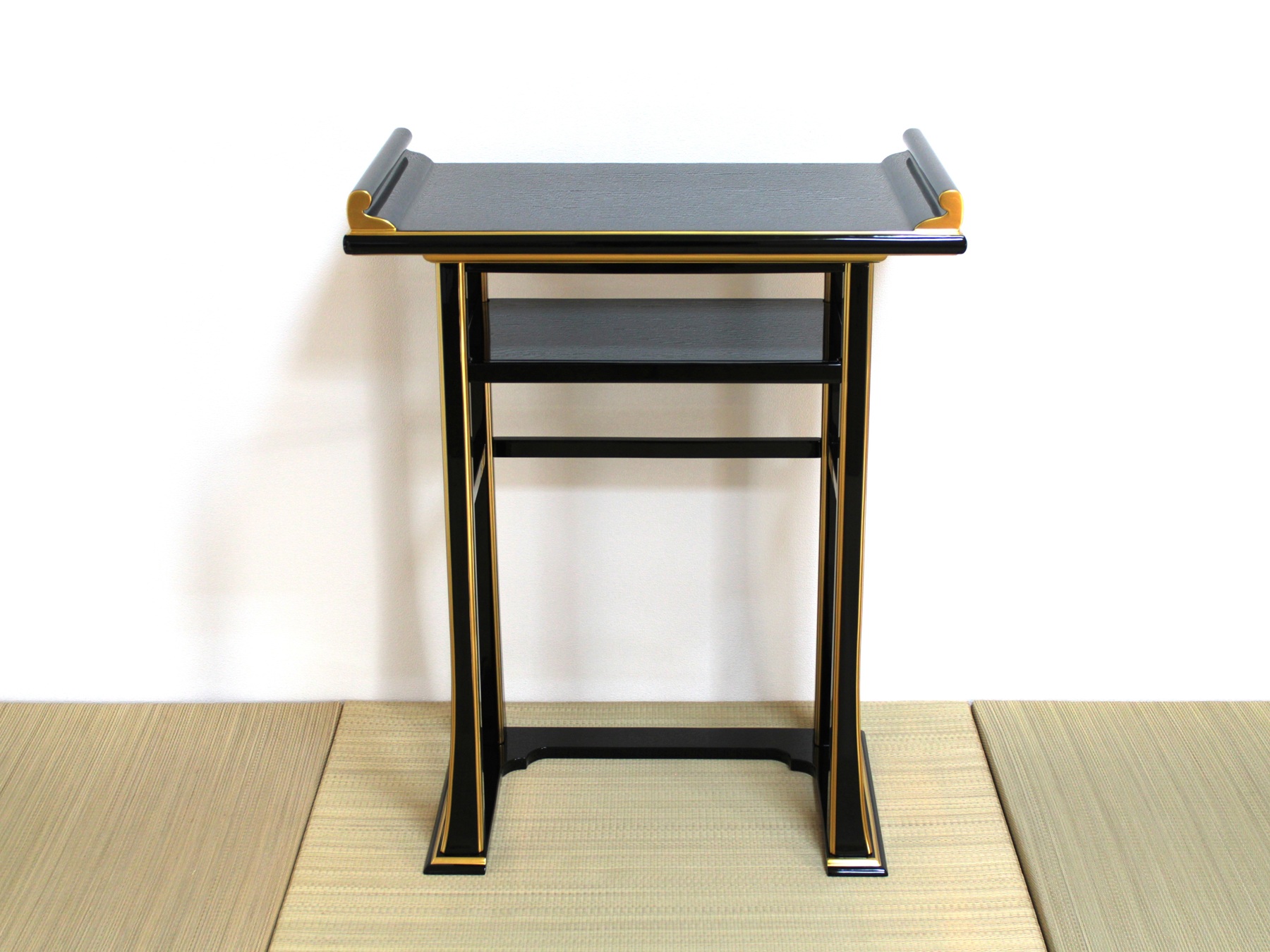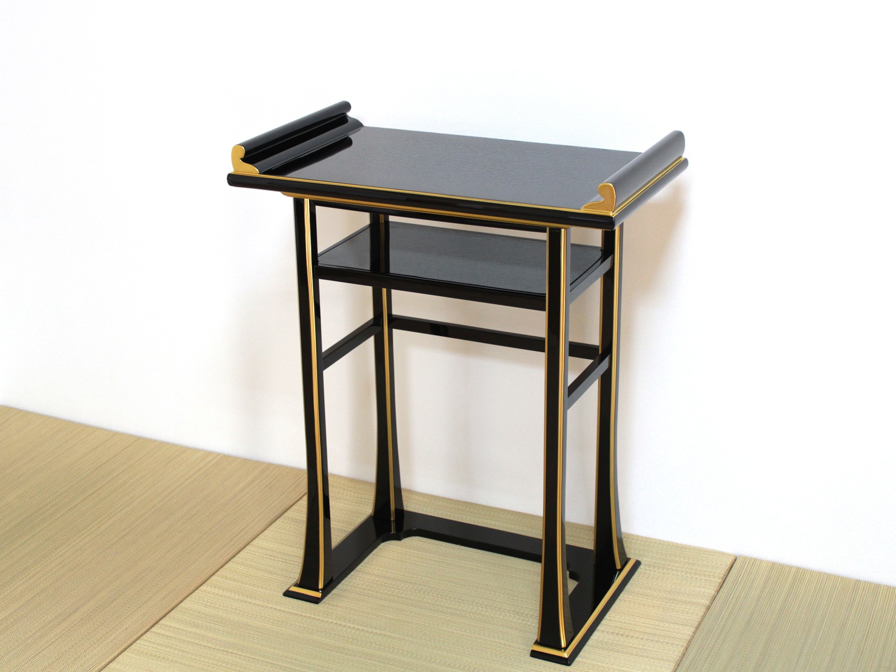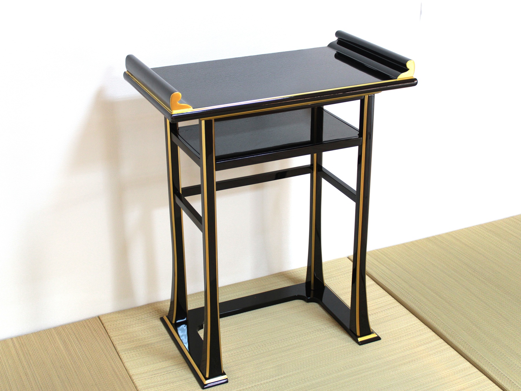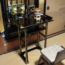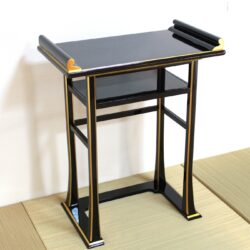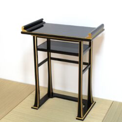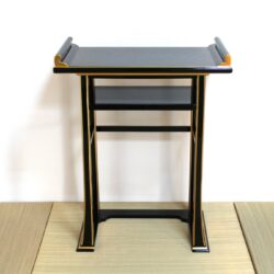 背高経机は椅子を使用された場合のお経机としてお使い頂けます。金仏壇と同じ黒塗りカシュー漆仕上げですので金仏壇の前に置いて頂くと質感や光沢が同じで似合います。また寺院や法事会館などでする立焼香机としてもご利用になれます。木製でカシュー漆が塗ってあり高級感があります。金の部分は金塗料仕上げなので、はがれる心配がなくお使い頂けます。固定式の棚板がついていて物が置けるようになっています。組み立てて頂く必要がなく、すべて固定された仕上がりになっています。