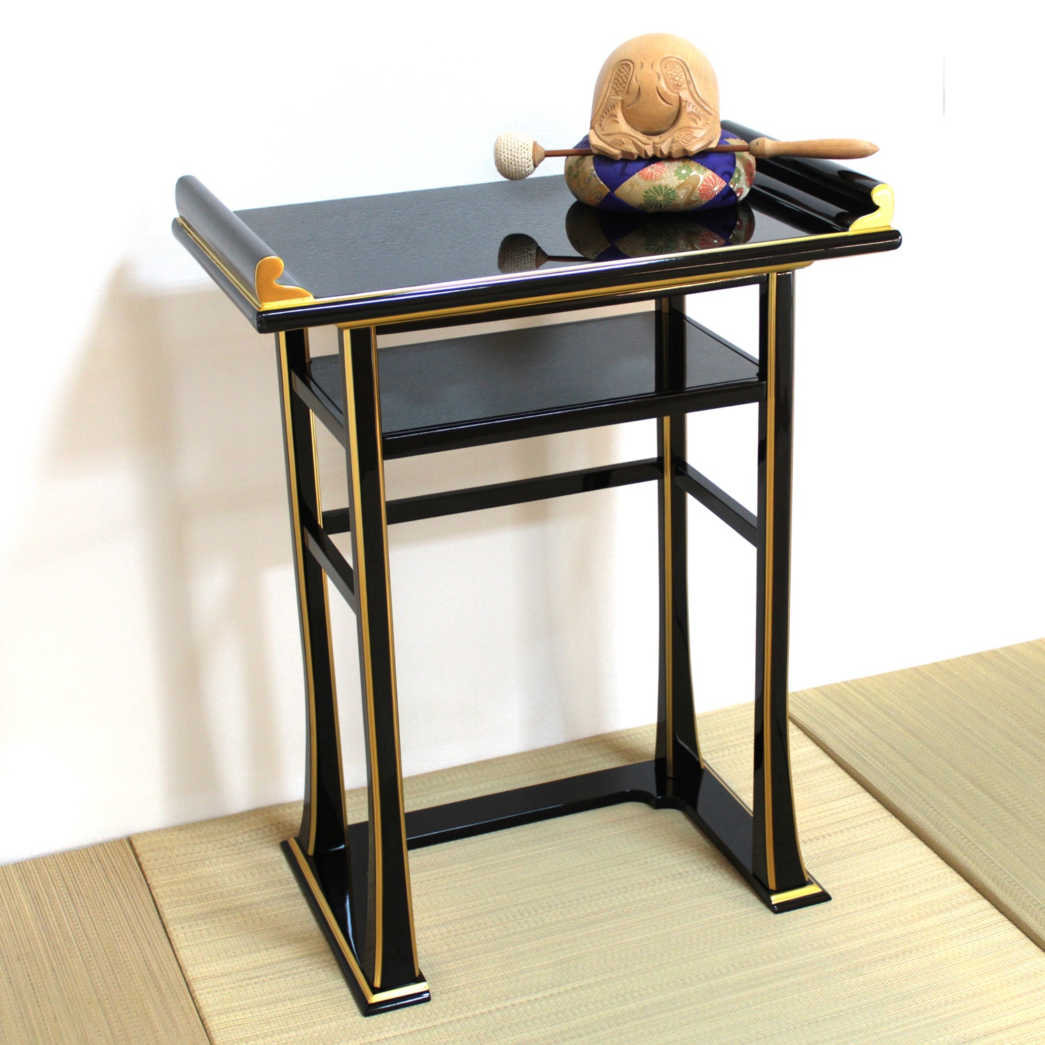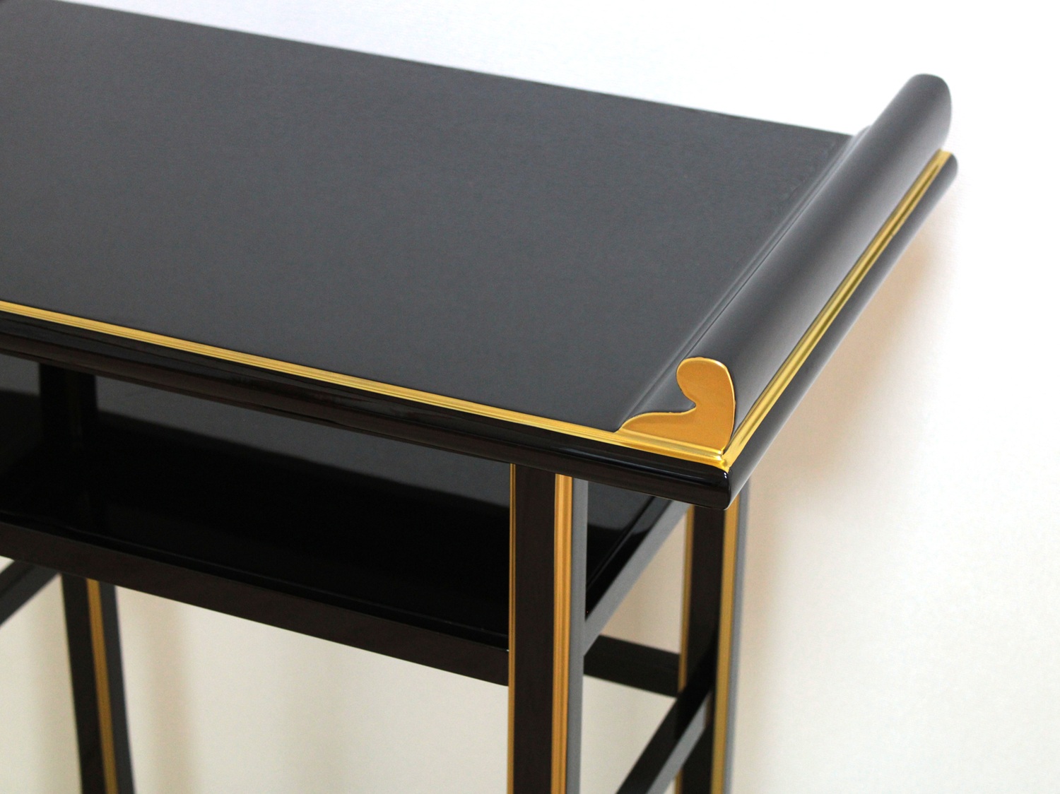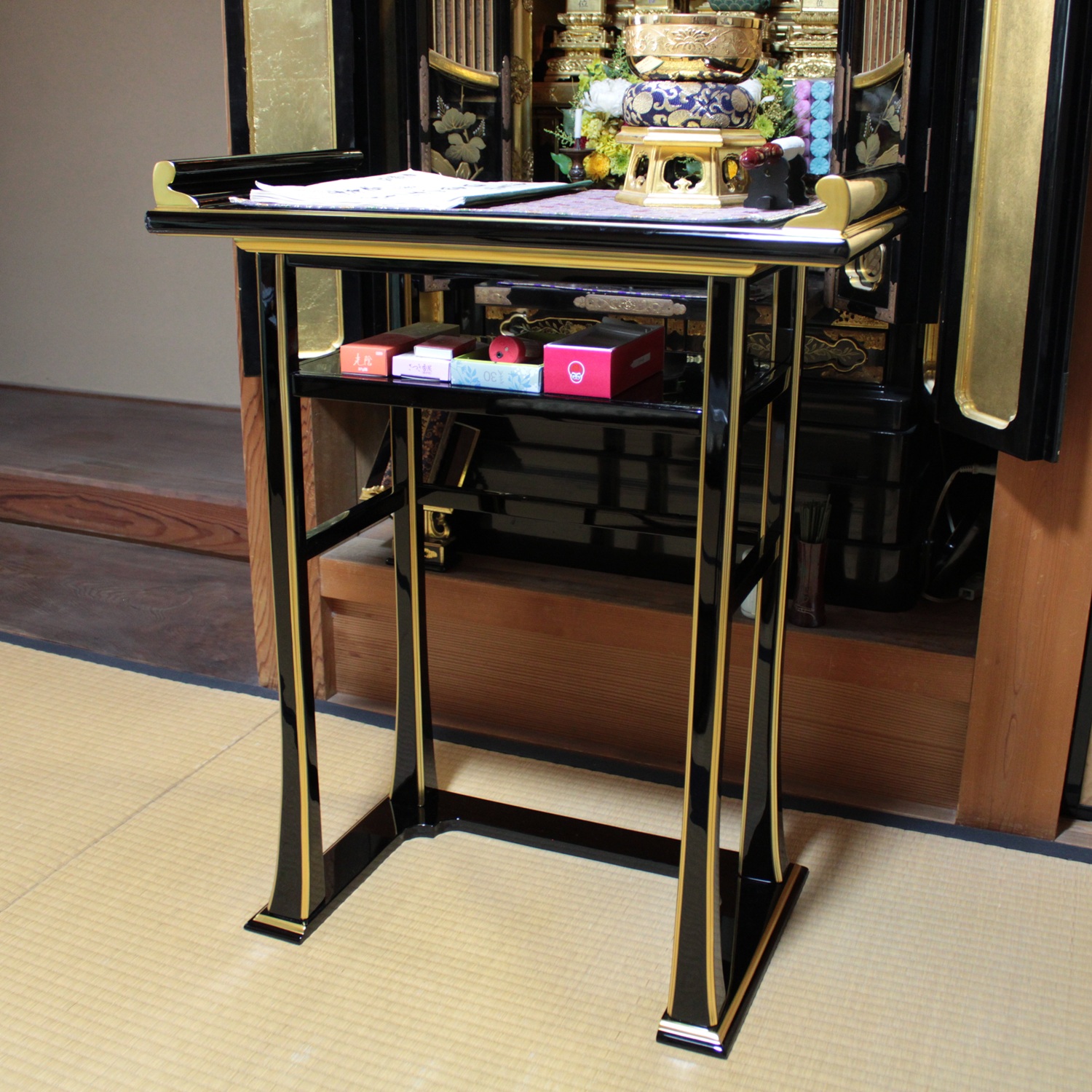 背高経机は椅子を使用された場合のお経机としてお使い頂けます。金仏壇と同じ黒塗りカシュー漆仕上げですので金仏壇の前に置いて頂くと質感や光沢が同じで似合います。また寺院や法事会館などでする立焼香机としてもご利用になれます。木製でカシュー漆が塗ってあり高級感があります。金の部分は金塗料仕上げなので、はがれる心配がなくお使い頂けます。固定式の棚板がついていて物が置けるようになっています。組み立てて頂く必要がなく、すべて固定された仕上がりになっています。