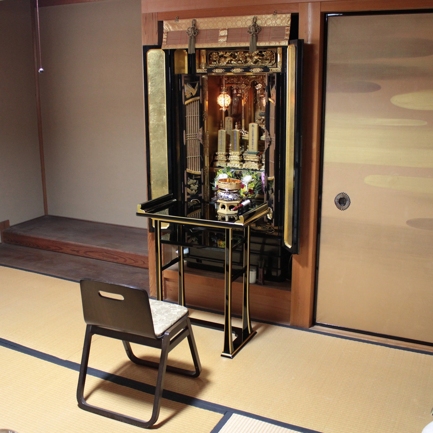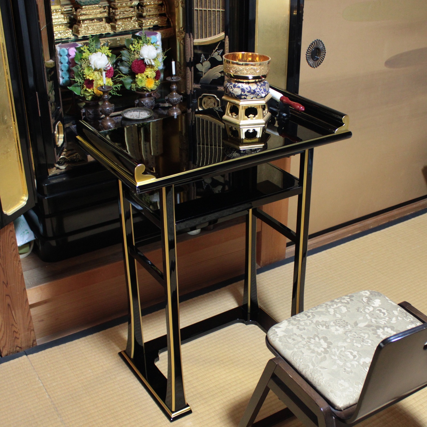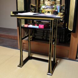 【経机】とは元来、お経をあげる時に経本、経巻をのせる机のことで、現在は仏壇の前に置きローソク立や線香立、おりんなどの仏具を置き、毎日のお参りに使用されています。お供え物を供えるのにも使うことができます。