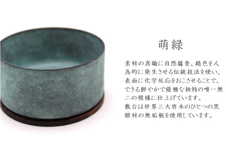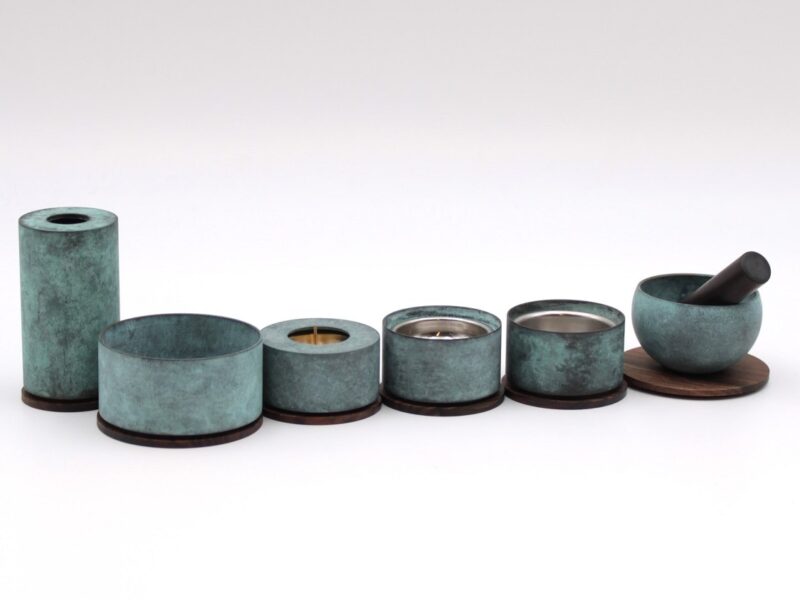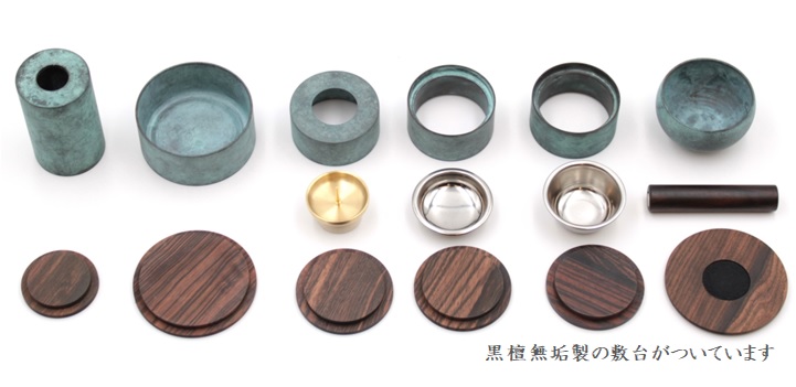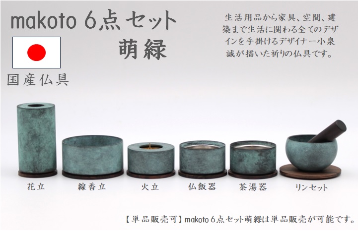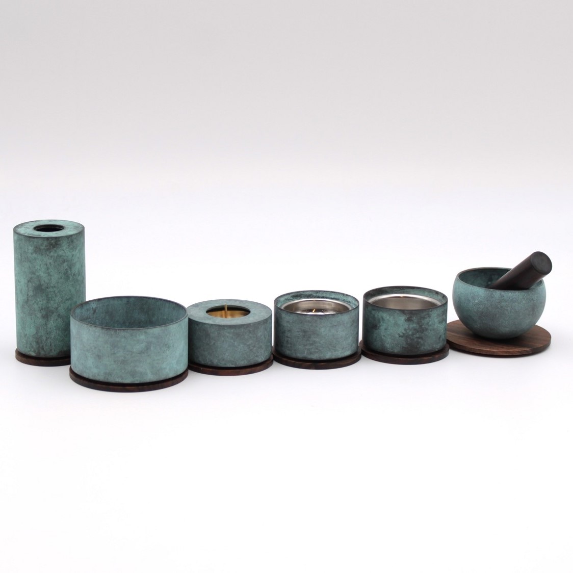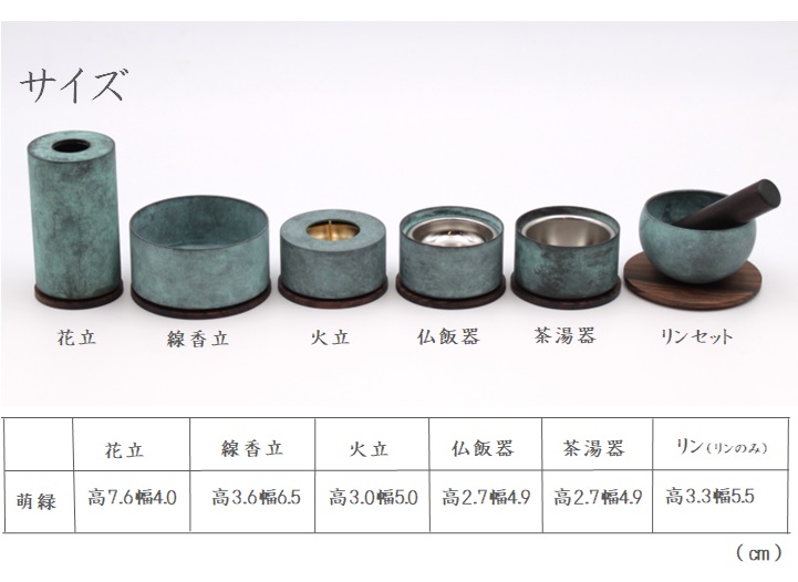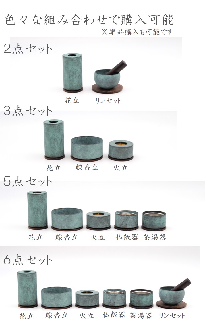 家具や建築、空間で活躍されているデザイナーの小泉誠さんがデザインした祈りの仏具です。銅の錆(さび)を緑青(ろくしょう)といい、その色合いを青銅色と呼びます。青銅色を発生させるには、銅素材の自然腐食・錆色を人為的に発色させる技法を用います。銅の素材が長い年月に渡り朽ちこのような鮮やで、優雅な色目を発生させるのですが、短時間で俄かに発生するには 様々な薬品、技法を使います。丹礬酢・硫酸銅・酢酸銅といった伝統的な薬品を調合し加熱しながら、時には日光の下で塗布 し、何度も何度も繰り返し塗布、ふきあげを行うことによって自然に形成されたものに近い青銅色を表面に発生させています。製造は日本最大の銅器の生産地である富山県高岡市にて製作された国産仏具です。上質な仏壇によく合う仏具セットです。