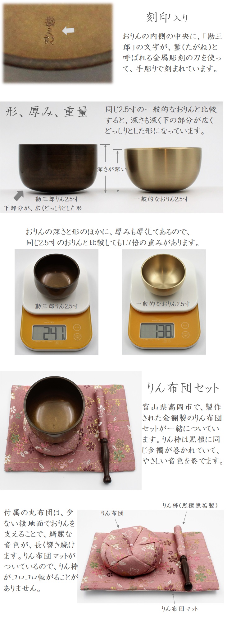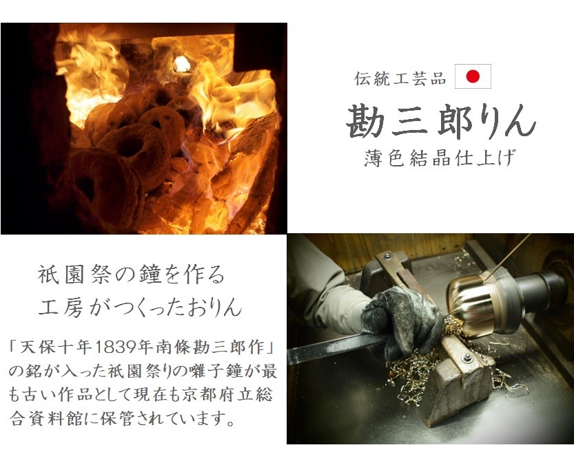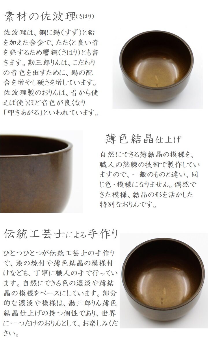 京都で作られた最高級の格調高い極上のおりんです。6代目南条勘三郎が生み出した「勘三郎りん」は佐波理製おりんの重厚感と高級感をより表すため高度な鋳造・加工技術をもって、深さ、厚み、重さを増やし、デザイン、質感、音色ともにより重厚感ある極上品です。乗せる金襴製の布団は富山県高岡市で製作され、伝統的な丸い形でおりんとの設置面積が少なくより長い間音色が響くようになっています。おりんと当たる部分に金襴が巻かれた黒檀製のりん棒で打つと柔らかい音が鳴ります。澄んだ音色と長い余韻が特徴で余韻の中にゆらぎがあり、とても心地よい音色を奏でます。