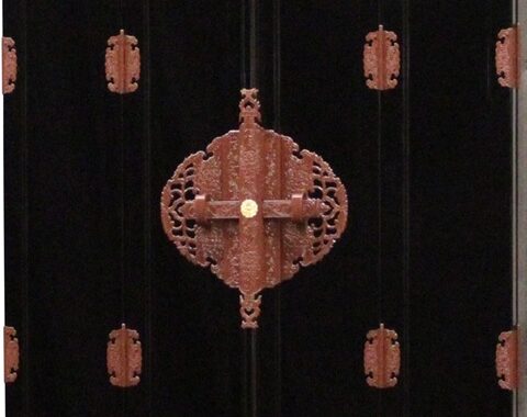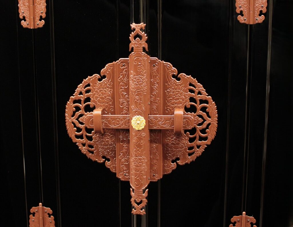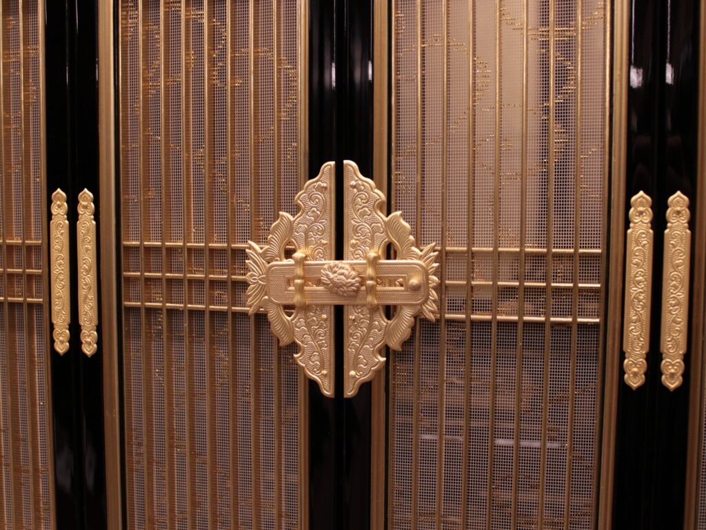 ・京色と呼ばれるエンジ色に着色し焼付塗装された真鍮製のかざり金具で京型仏壇の正面はかざられています。