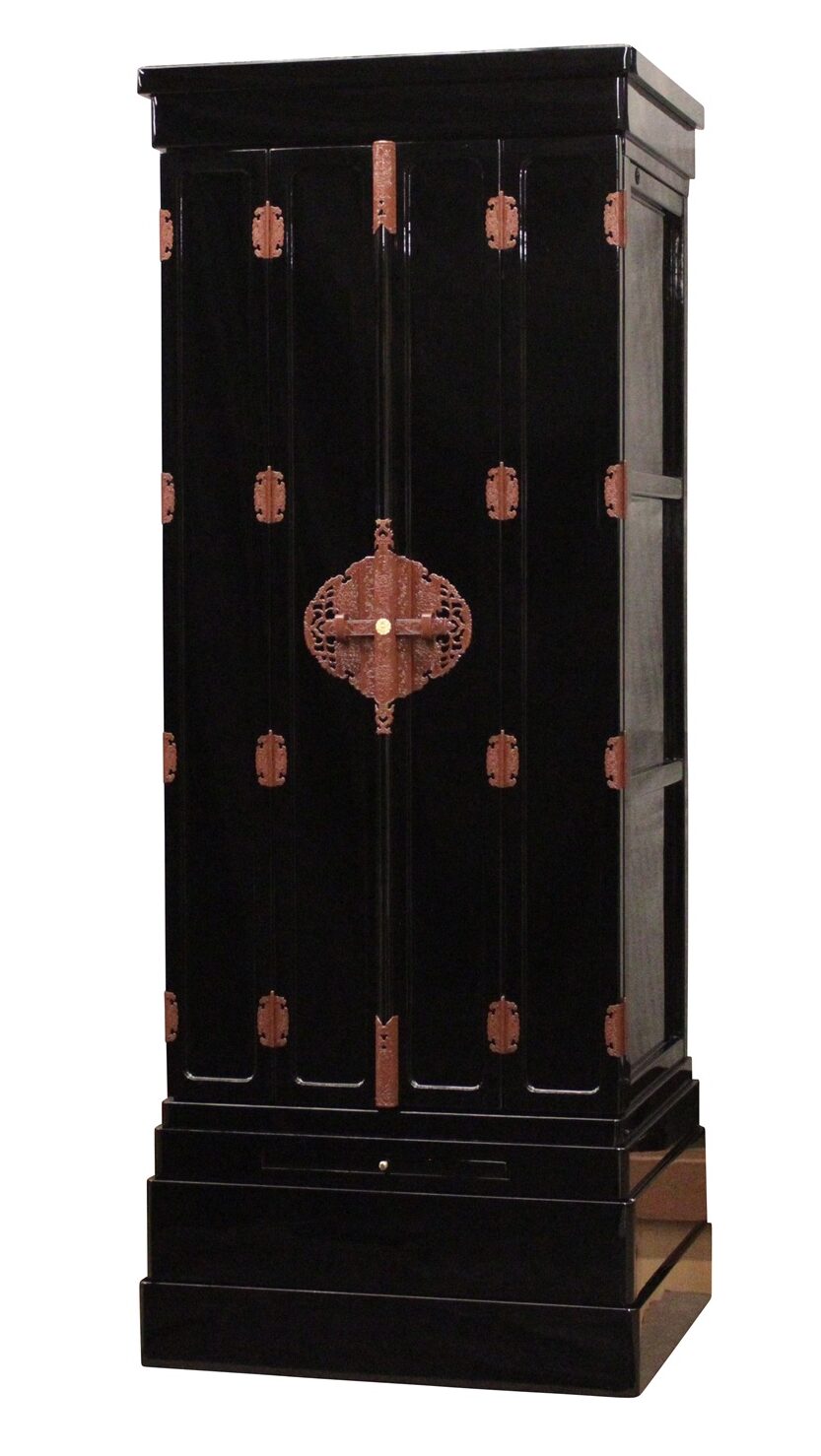 正面は黒塗り仕上げで真鍮製のかざり金具を打っています。内側は組子障子になっています。